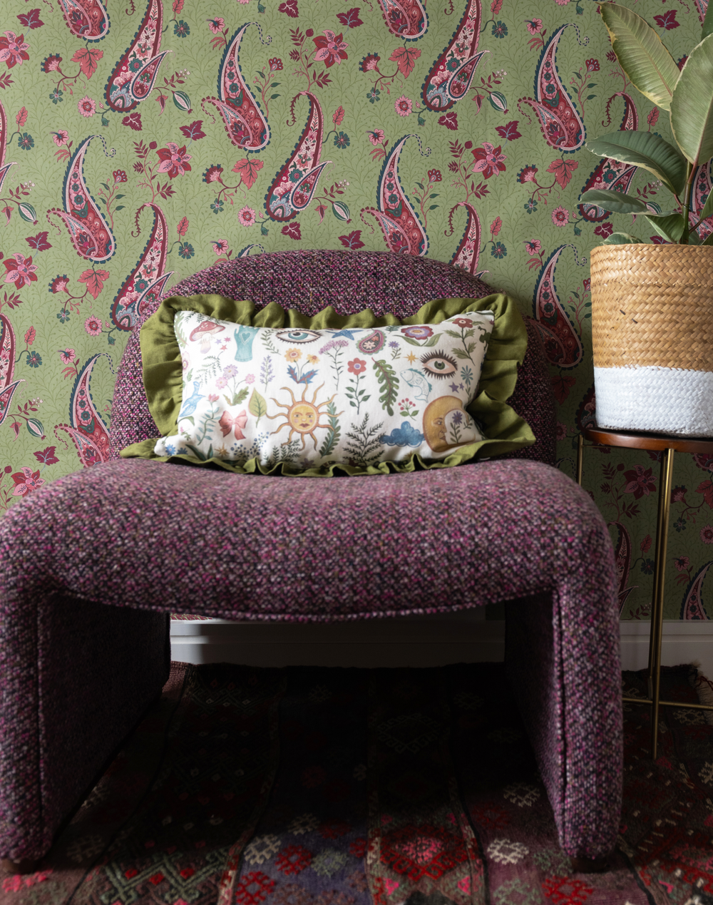 Transform your space with Kasbah Wallpaper in Verdigris. Our print 'Kasbah' features iconic paisley motifs, a persian symbol thought to resemble a stylised Boteh, promoting eternity, fertility, resilience and abundance. Expertly hand drawn and named after the charming Kasbah region in Morocco where our inspiration flourished. This luxurious wallpaper is showcased in a vibrant palette of raw henna green infused with pops of deep teals and burgundies to provoke a rich harmonious and visually striking aesthetic.