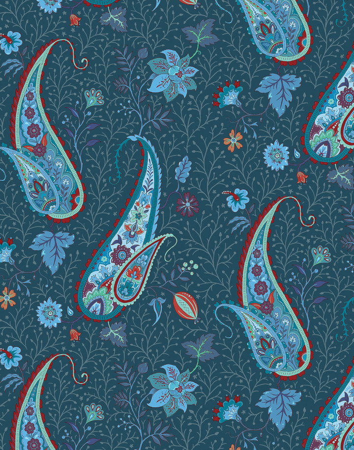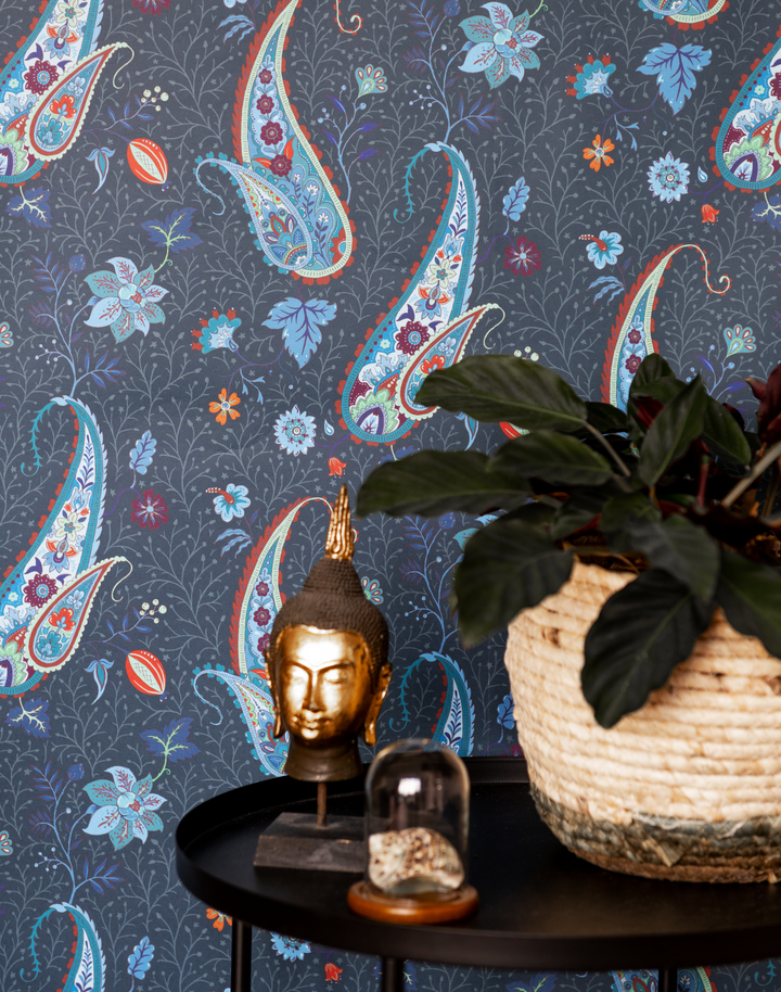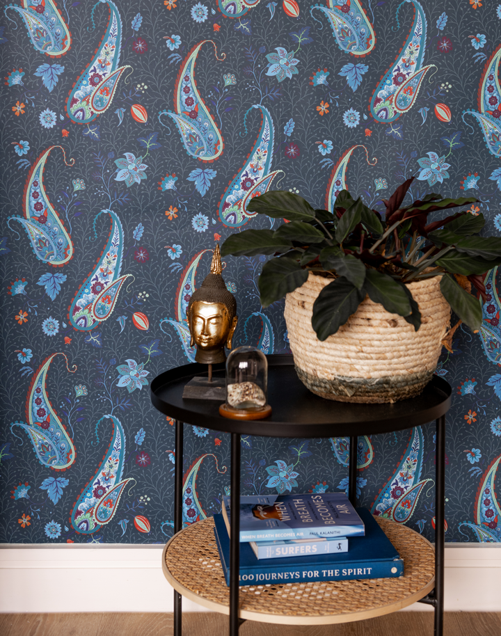 Transform your space with Kasbah Wallpaper in Verdigris. Our print 'Kasbah' features iconic paisley motifs, a Persian symbol thought to resemble a stylized Boteh, promoting eternity, fertility, resilience and abundance. Expertly hand drawn and named after the charming Kasbah region in Morocco where our inspiration flourished. The Midnight colorway is inspired by the mysterious allure of Marrakesh after dusk to evoke the city's enchanting nightscape. The palette draws from moonlit courtyards, shadows and the glow of lanterns.