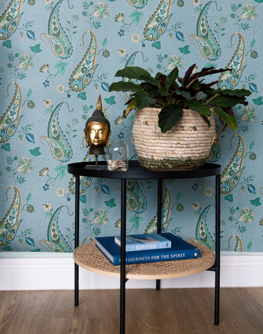 Transform your space with Kasbah Wallpaper in Verdigris. Our print 'Kasbah' features iconic paisley motifs, a Persian symbol thought to resemble a stylized Boteh, promoting eternity, fertility, resilience and abundance. Expertly hand drawn and named after the charming Kasbah region in Morocco where our inspiration flourished. This luxurious wallpaper is showcased in stunning chalky plaster pinks embodying the pinky hues of the sun bleached Medina.