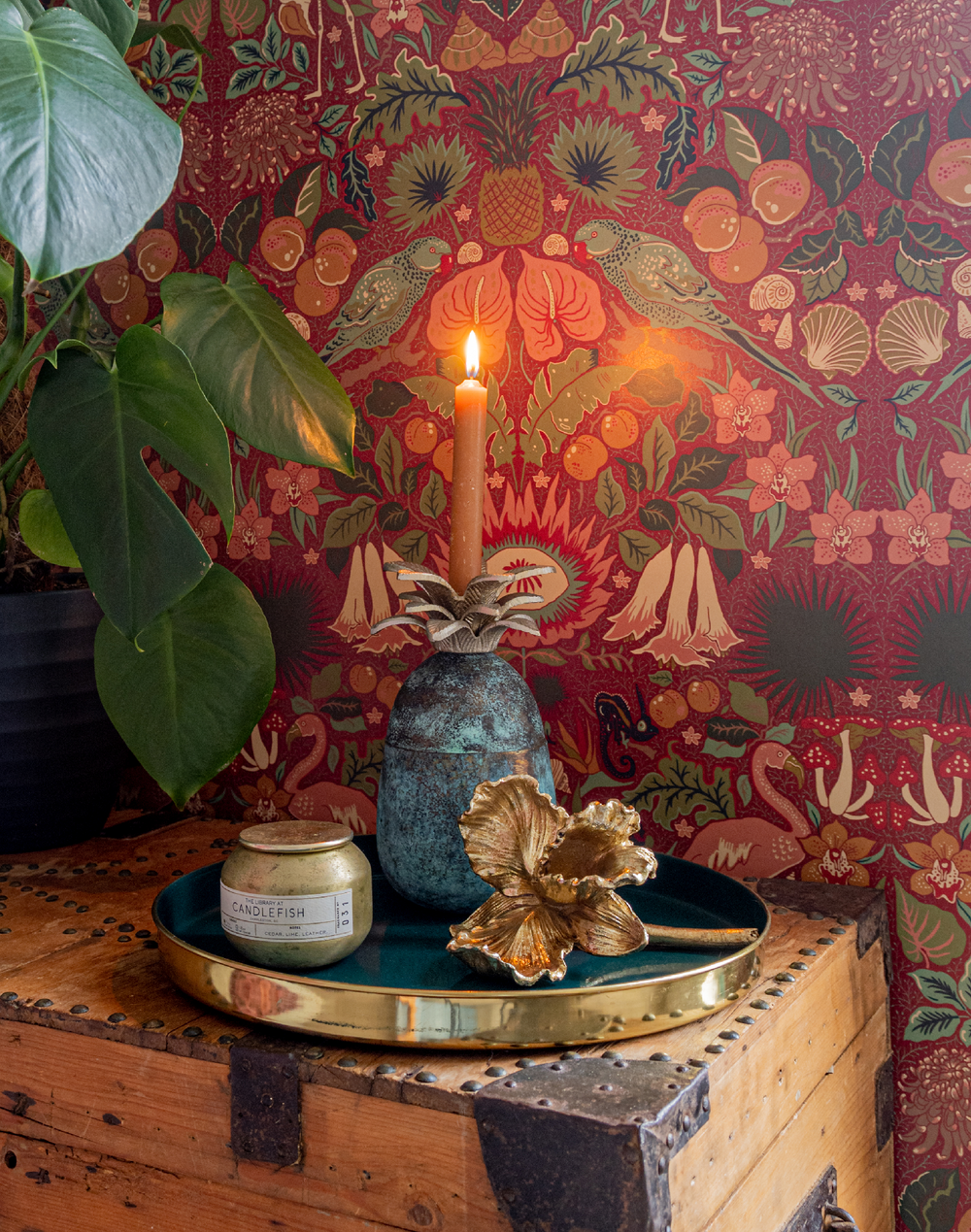 Oasis is our tropical inspired Arts and Crafts design featuring the mirroring techniques seen in the legendary print designer William Morris' work. Oasis is just that, a beautiful sanctuary that provides a tropical refuge amongst the busyness of day-day life. Oasis features gorgeous birds of paradise such as stunning parrots amongst pineapples, palms, peaches and proteas! Our modern and fun approach on our favorite style of wallpaper. This is our wonderful Crimson-Red colorway with hints of mint-green, orange and coral pink. This deep red colorway is warm and inviting. Red is symbolic of life, love and passion. This stunning and sophisticated colorway conjures feelings of serenity and comfort.
