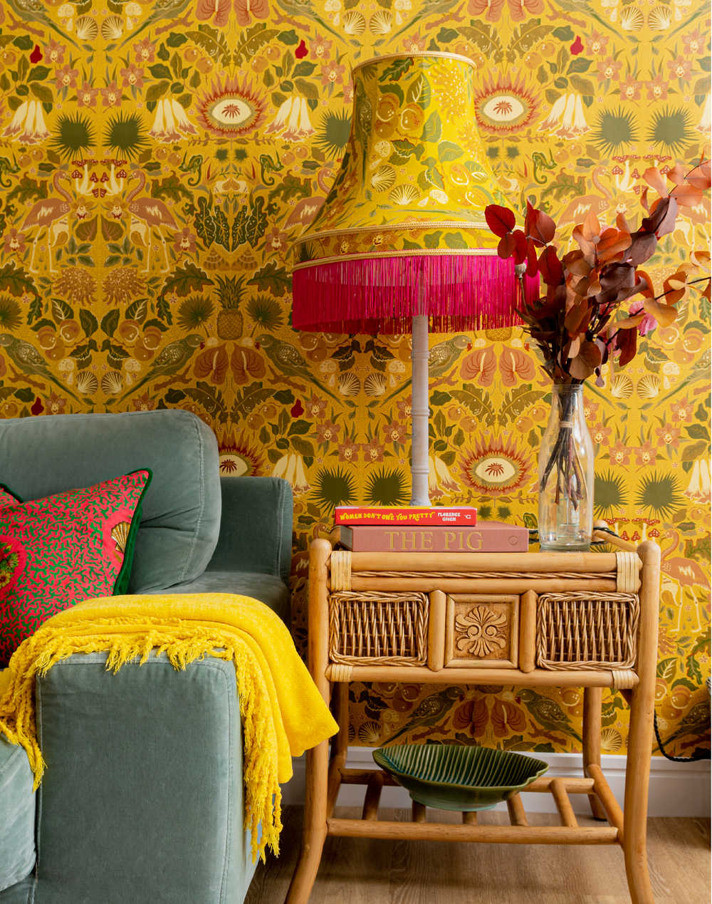 Oasis is our tropical inspired Arts and Crafts design featuring the mirroring techniques seen in the legendary print designer William Morris' work. Oasis is just that, a beautiful sanctuary that provides a tropical refuge amongst the busyness of day-day life. Oasis features gorgeous birds of paradise such as stunning parrots amongst pineapples, palms, peaches and proteas! Our modern and fun approach on our favorite style of wallpaper. This is our wonderful Marigold yellow colorway with hints of sage green, peach, burnt orange and mustard. Yellow is the color of happiness ad optimism so we encourage you to go brave with yellow and find happiness in your home!