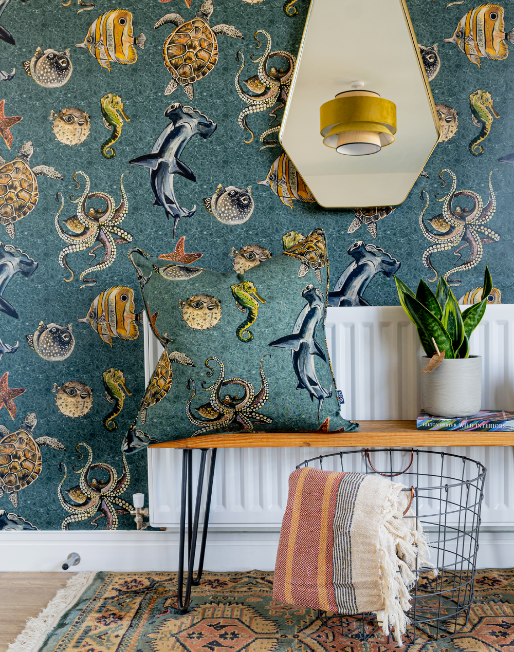 Thalassophile comes from the Greek word 'Thalass' meaning Ocean and together means 'Lover of the sea.' This moniker is also the title of the collection. Our gorgeous under-the-sea print features hammerhead sharks, pufferfish, starfish and turtles! All hand painted and laid on a bubbly, marbled background to mimic the ocean. Our Aegean-Blue colorway is rich and warm but true to nature and imitates the color of the deep blue sea. The sea creatures are all in warm earthy tones and would set the scene beautifully for a neutral palette. As this is such a fun print we see this used in bedrooms, bathrooms and utilities but would certainly look good anywhere you put it!