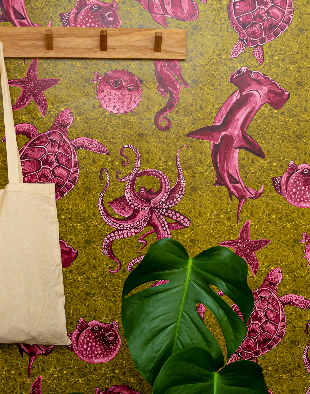 Thalassophile comes from the Greek word 'Thalass' meaning Ocean and together means 'Lover of the sea.' This moniker is also the title of the collection. Our gorgeous under-the-sea print features hammerhead sharks, pufferfish, starfish and turtles! All hand painted and laid on a bubbly, marbled background to mimic the ocean. Our Chartreuse and hot-pink Colorway has a real WOW factor. The contrasting colors of green and pink are truly sublime. The marble background pops beautifully in the gorgeous and sophisticated lime green tones and the vivid pink sea creatures create a fun and feminine vibe. This colorway packs a statement punch and turns you walls into a maintenance free aquarium!