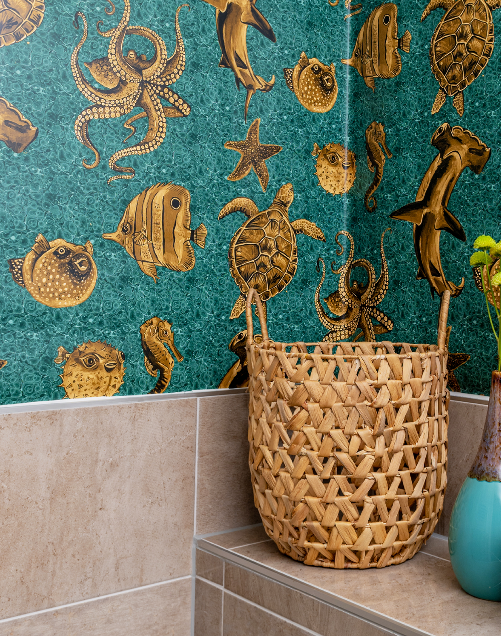 Thalassophile comes from the Greek word 'Thalassa' meaning Ocean and together means 'Lover of the sea.' This moniker is also the title of the collection. Our gorgeous under-the-sea print features hammerhead sharks, pufferfish, starfish and turtles! All hand painted and laid on a bubbly, marbled background to mimic the ocean. Our Ocean-Blue colorway is reminiscent of warm tropical waters and features our sea creatures in gorgeous rich gold tones. This really is a beautiful statement wallpaper and would certainly be the talking point of any room. Go bold and this colorway will evoke a sense of grandeur. We see it paired with gold fixtures and accessories in period properties within bathrooms and hallways.