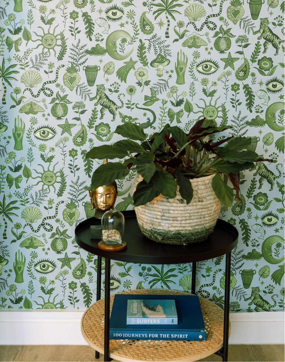 Our design 'Trove' is inspired by the treasure 'trove' of artisan goods found within the Medinas souks. Each symbol we've painted can be found as brass 'Talisman' wall hangings imbued with cultural and spiritual meanings. They are designed to be hung above your front door to ward off evil and negative energys and act as a spiritual safegaurd to the household. Other symbols are used to attract blessings, peace and good fortune. This intricate print has been coloured in soft sky blue and foliage green colourway inspired by the expansive sunny blue skies contrasted with the lush greenery found in the beautiful palace and hotel gardens around the city.