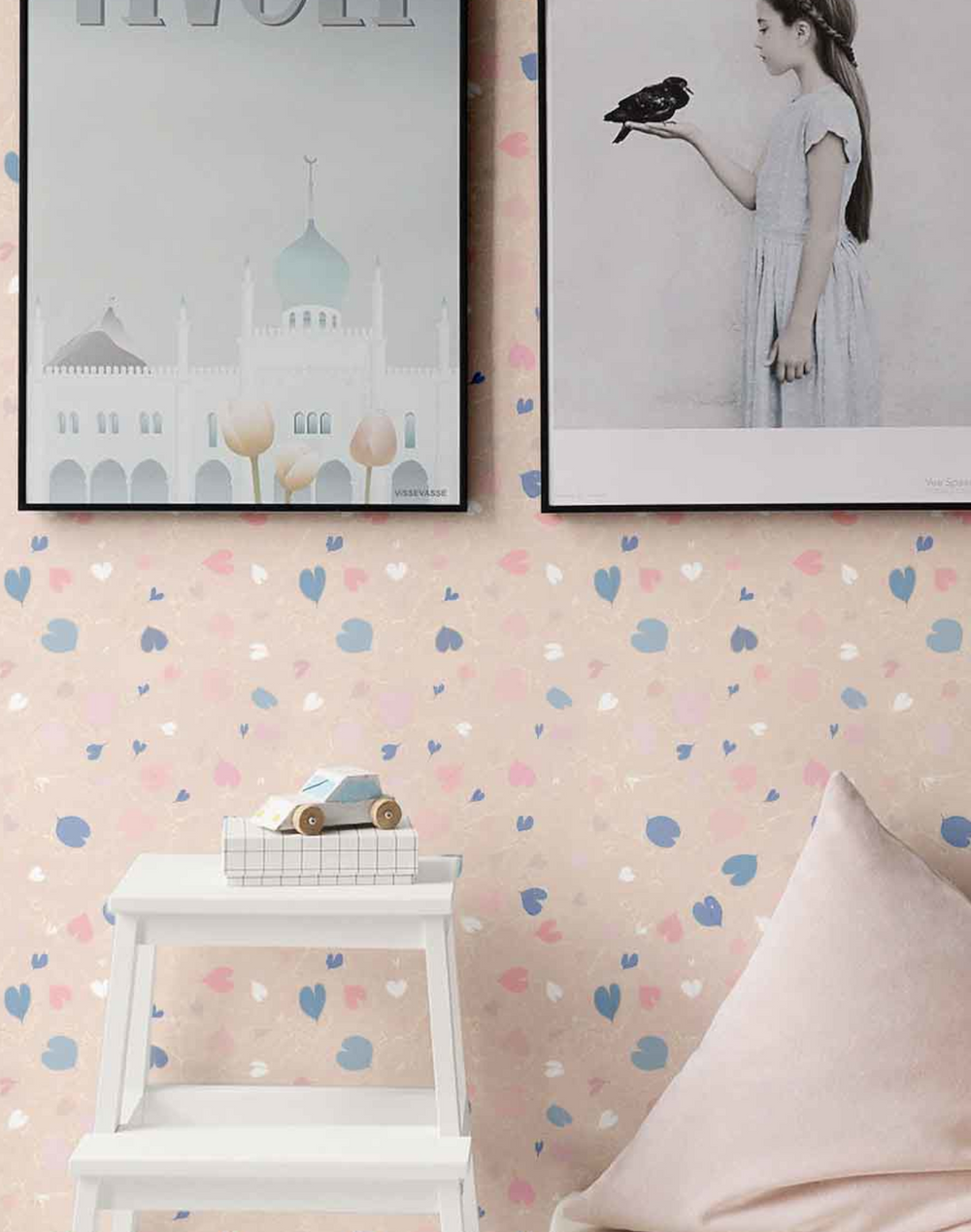Amore is mainly a children's bedroom wallpaper. With its chalk pink background and beautifully subtle hearts, it creates an atmosphere that is both charming and magical, which is exactly what you want in a child's bedroom. You could also use this wallcovering in a feminine powder room or bathroom to compose an uplifting and calm interior scheme that exudes the synergy between art, design and love.