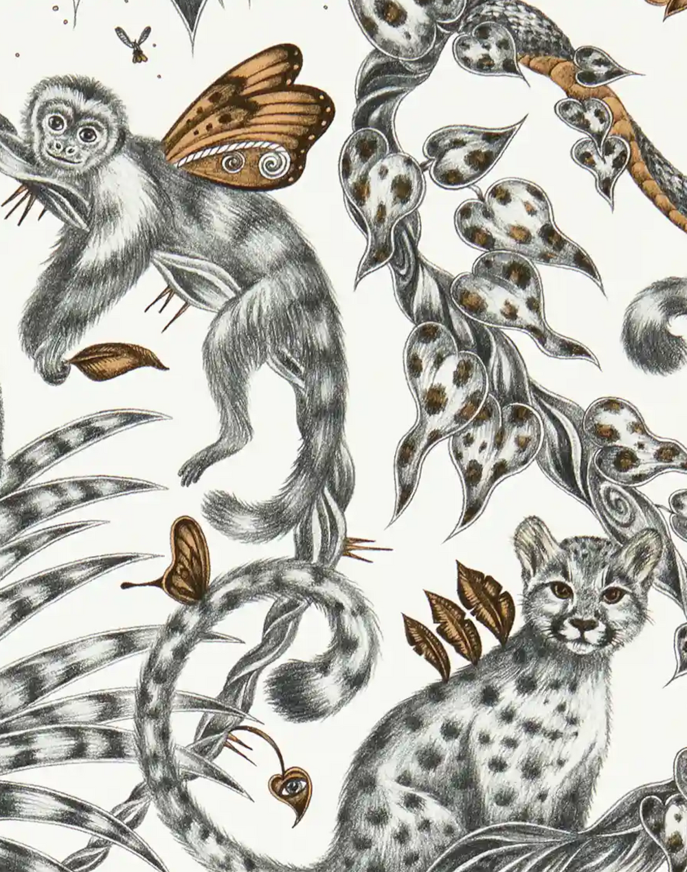 Enter a jungle dreamscape influenced by Emma's experiences traveling through Costa Rica's Osa Peninsula, which is home to some of the planet's most biodiverse regions. Taking center stage, a mysterious puma stands as macaws, monkeys, sloths, ocelots, and other magical woodland creatures surround. This digitally created wallpaper is stunning and captivating.