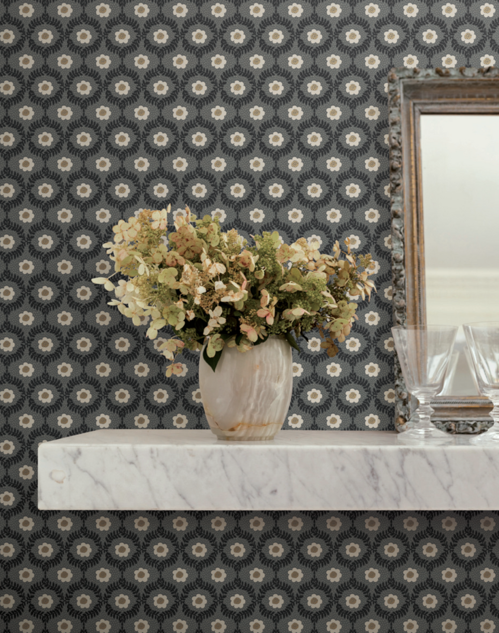 Simple flowers are framed by delicate leaves, with tiny metallic dots filling the background on our Emma wallpapers.