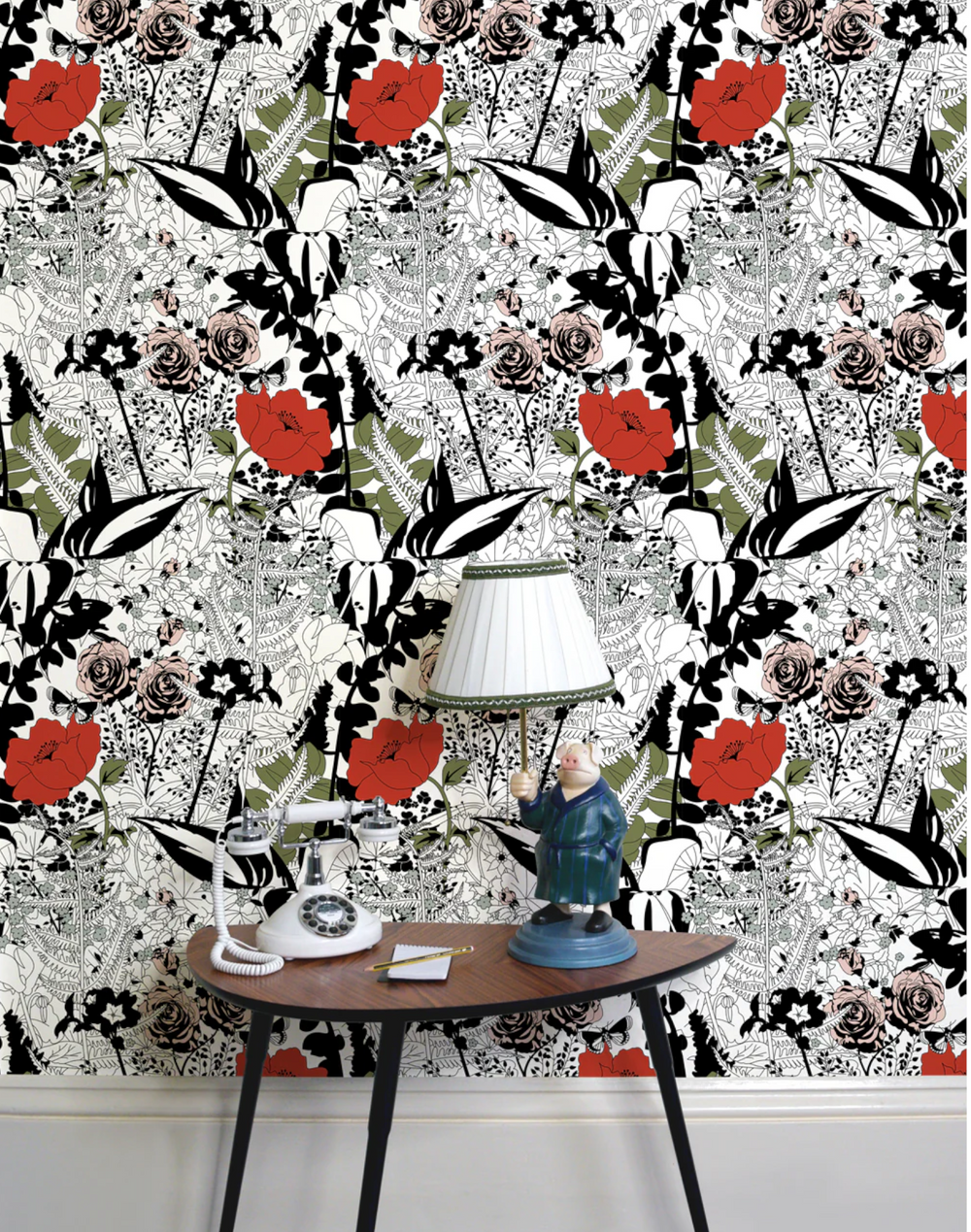 All the flora and fauna are captured in this bold, floral country garden wallpaper. Look closely at the charming English Garden design and you will see an abundance of summer delights and details waiting to be discovered! This attention to detail and illustrative style is what sets Dupenny apart from other pattern designers. Renovate those tired walls and bring a slice of the British countryside inside. This color interpretation includes flashes of red, green, pink, and grey to really make this design spring to life.