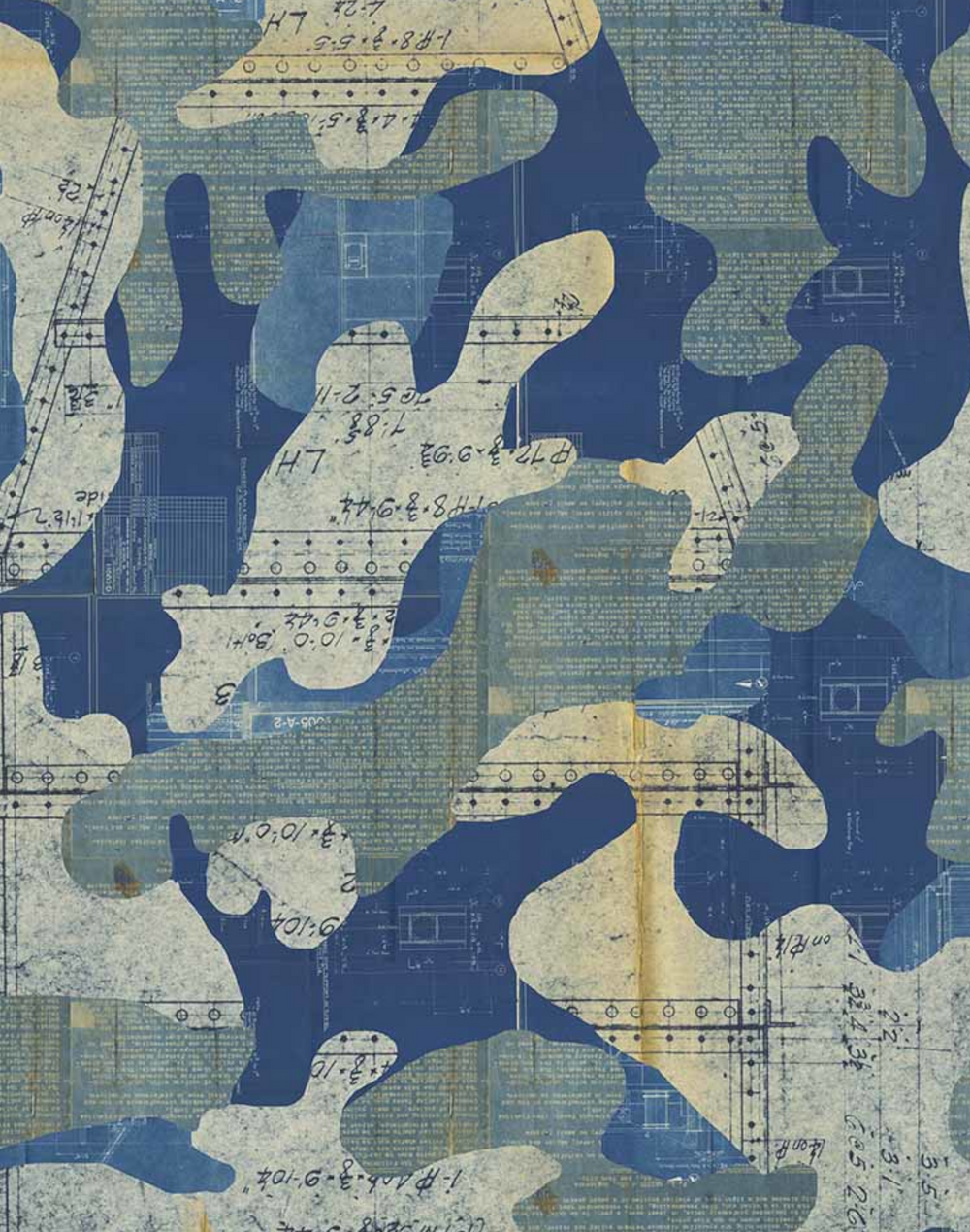 Intrigued by the idea that blueprints and cammo could have a utilitarian purpose, Merenda created Escape. She combined found vintage blueprints (from the turn of the 20th century) with a fluid, hand-drawn camouflage pattern. This fusion created an opposite effect, achieving a sophisticated yet urban feel.