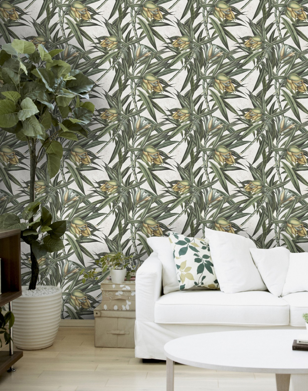 Oozing fresh tropical vibes, the EXOTIC FRUIT II premium wallpaper gives way to a lush arrangement of tropical vegetation. Abundant equatorial leaves dominate the high-quality wallcovering, generously complementing the unique charm of juicy exotic fruits. In an almost monochrome canvas of light green, the premium wallpaper design blends several shades of green and yellow into a natural background fit for any space.