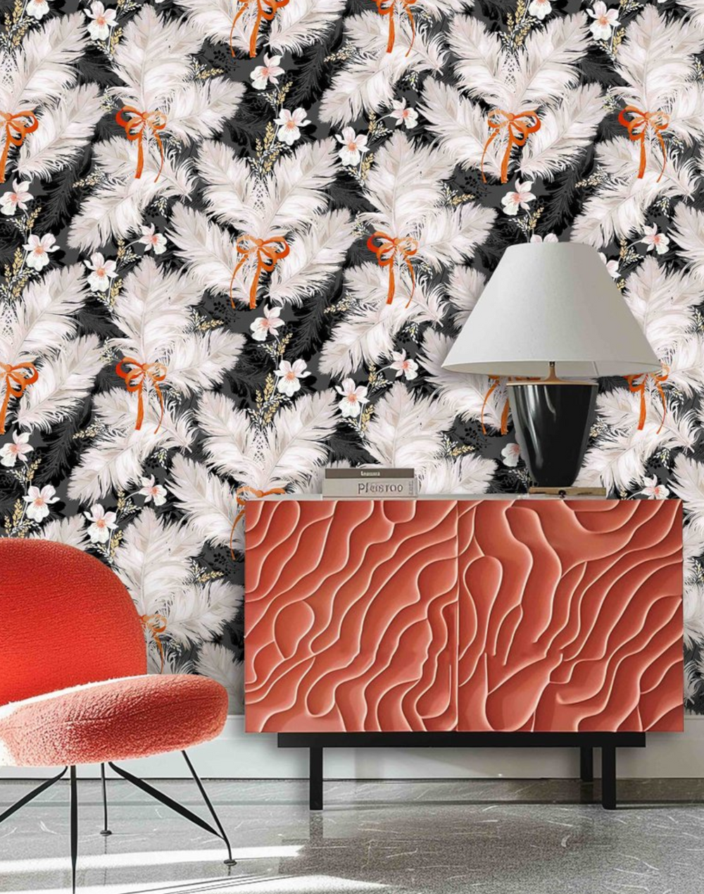 Feathered Folly vintage style wallpaper is an archive design reimagined in dark moody colors for a captivating and dramatic effect. The dark and moody color palette will add an opulent touch to any space.