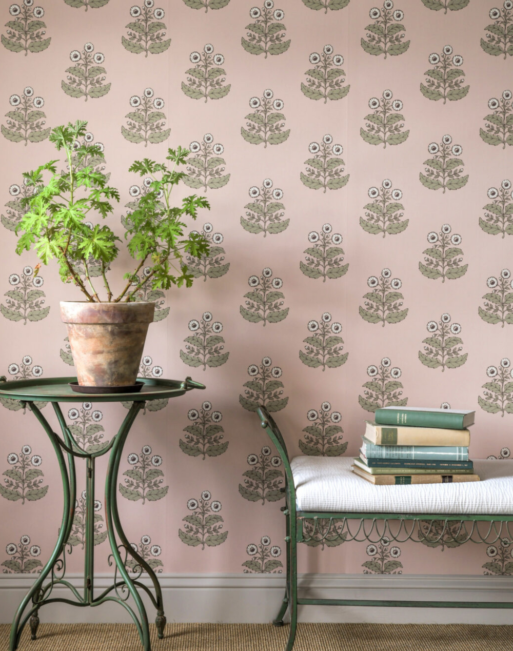 This charming flower print, with inspiration from old woodblock printed fabrics, adds a playful atmosphere to the interior.