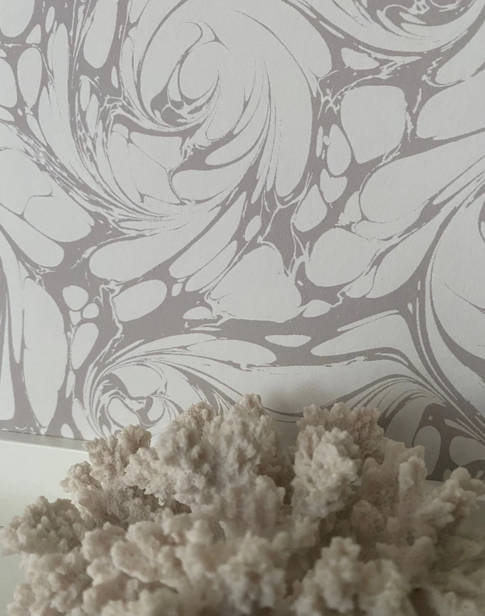 Flourish is loosely based on the historic ‘Snail’ or ‘Curl’ marble pattern, which was first created in France in the mid-17th Century. Traditionally this design would have been made up of a palette of several colors and a ‘comb’ consisting of many pins would have been used to create a uniform curl across the sheet.  At House of Amitié, we've modernized this pattern by creating it in 3 separate mono palettes for a minimal and fresh take on this timeless design. In addition, a chunky stylus (similar to a dowelling rod or thick knitting needle) has been used to draw random swirls into the paint to provide more energy and flow to the design.