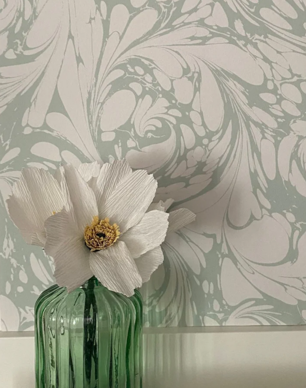 Flourish is loosely based on the historic ‘Snail’ or ‘Curl’ marble pattern, which was first created in France in the mid-17th Century. Traditionally this design would have been made up of a palette of several colors and a ‘comb’ consisting of many pins would have been used to create a uniform curl across the sheet.  At House of Amitié, we've modernized this pattern by creating it in 3 separate mono palettes for a minimal and fresh take on this timeless design. In addition, a chunky stylus (similar to a dowelling rod or thick knitting needle) has been used to draw random swirls into the paint to provide more energy and flow to the design.