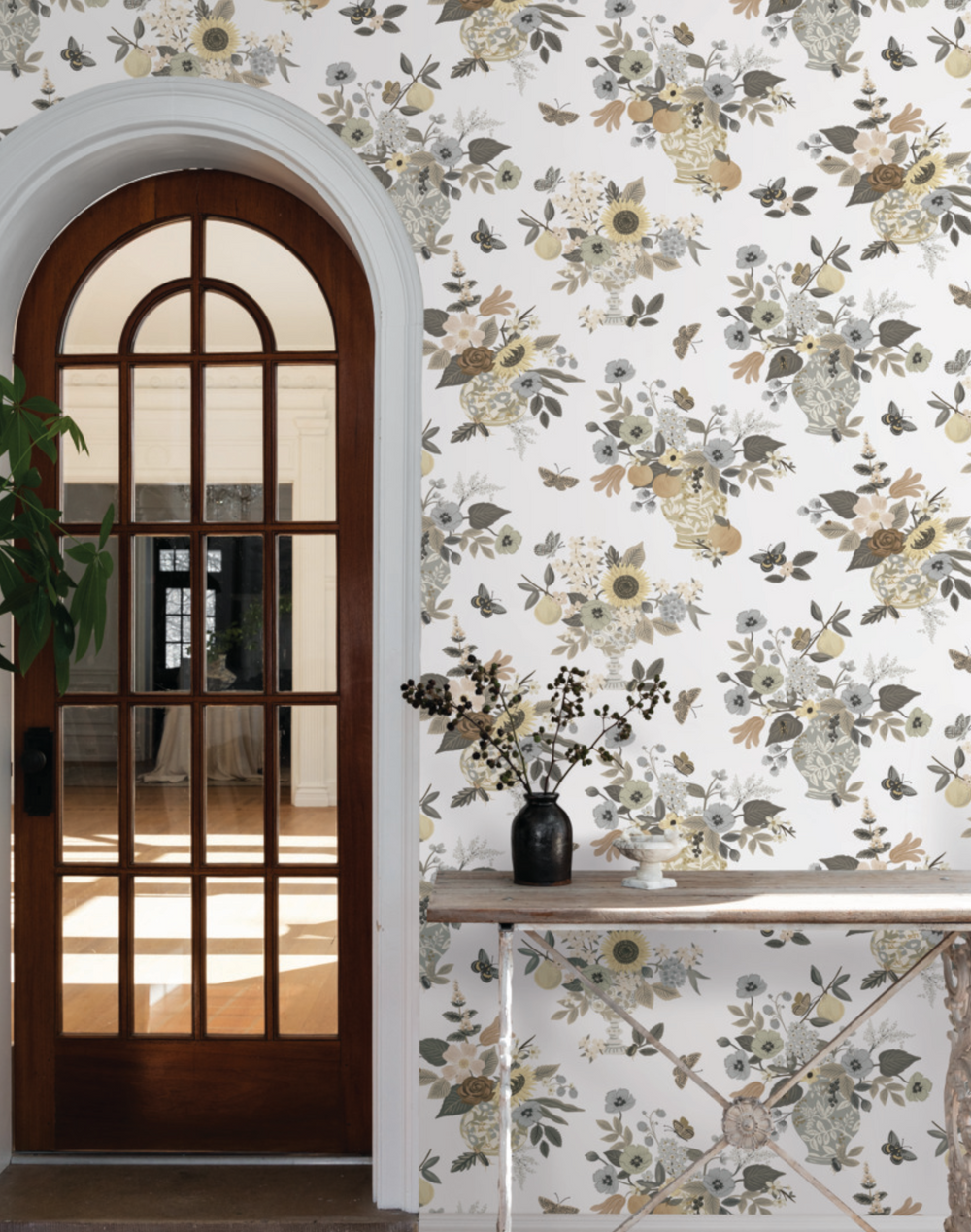 Vases overflow with lush arrangements on our Flower Studies wallpaper, accented with a few fluttering butterflies.
