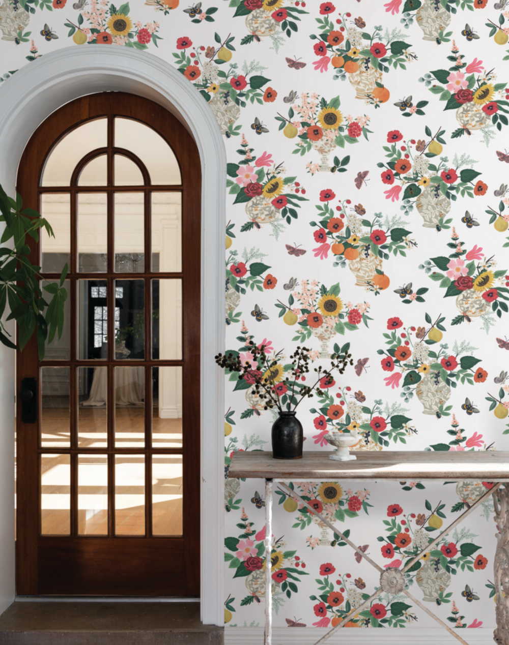 Vases overflow with lush arrangements on our Flower Studies wallpaper, accented with a few fluttering butterflies.