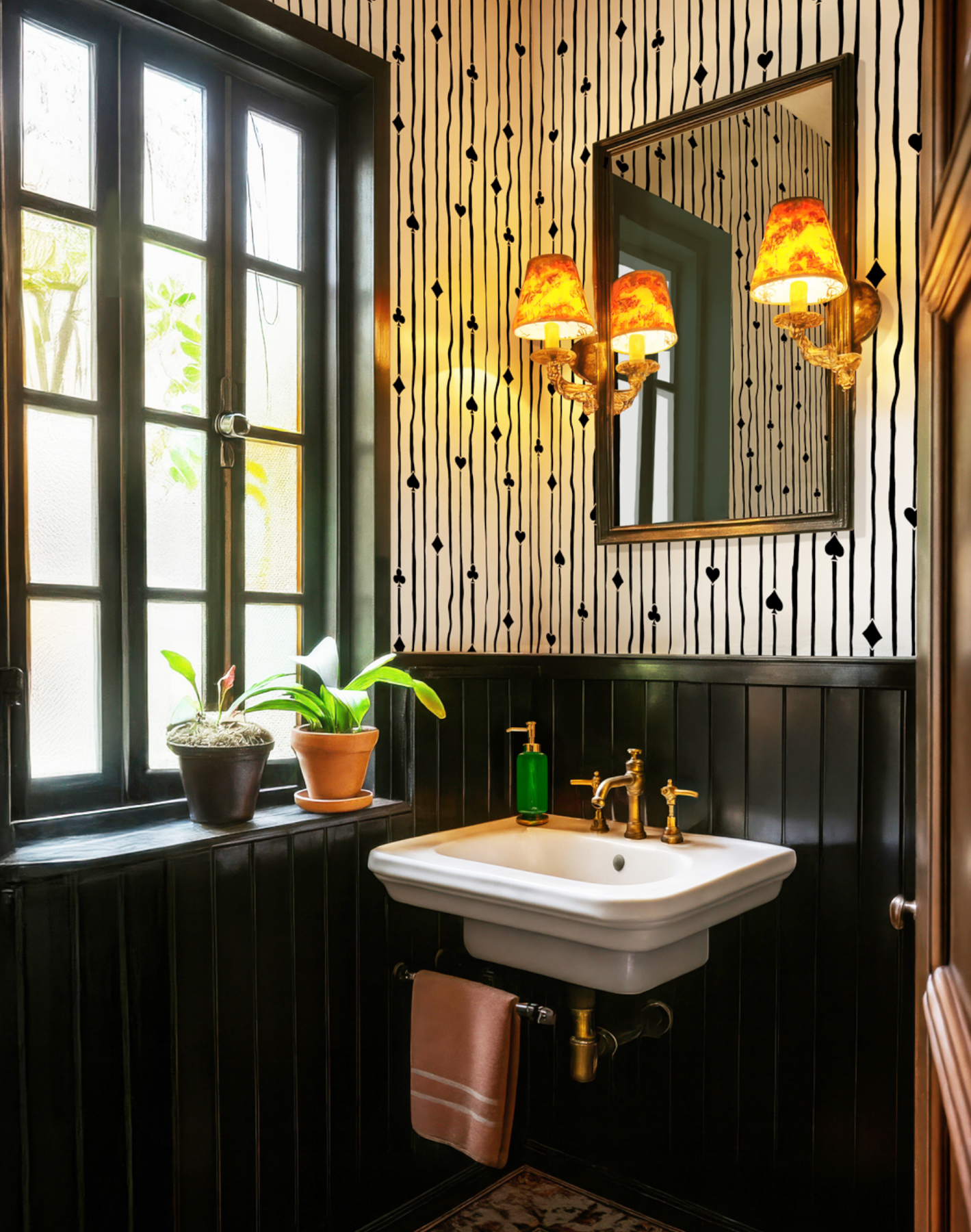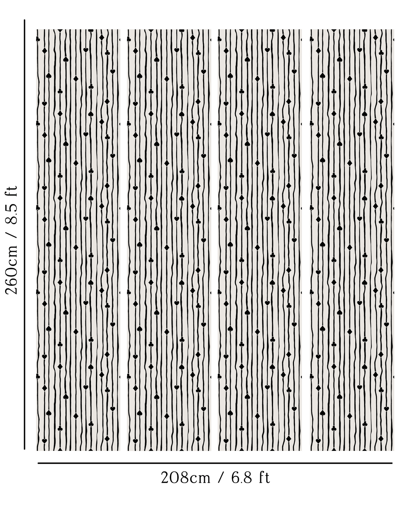 Quirky and playful, this hand-drawn striped wallpaper is adorned with hearts, spades, clubs and diamonds. In a refined black and white palette, this version feels crisp and graphic - perfect for adding subtle pattern and charm without overpowering a space.