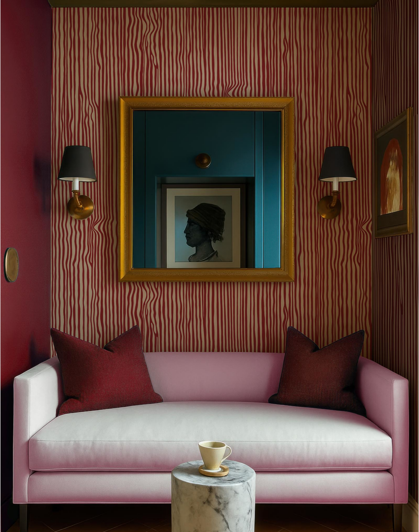 Hand-drawn striped wallpaper with a nod to Picasso and Jean Cocteau’s expressive line drawings. The deep red / burgundy colorway brings a sense of warmth, intimacy, and vintage glamour - a perfect backdrop for richly layered interiors.