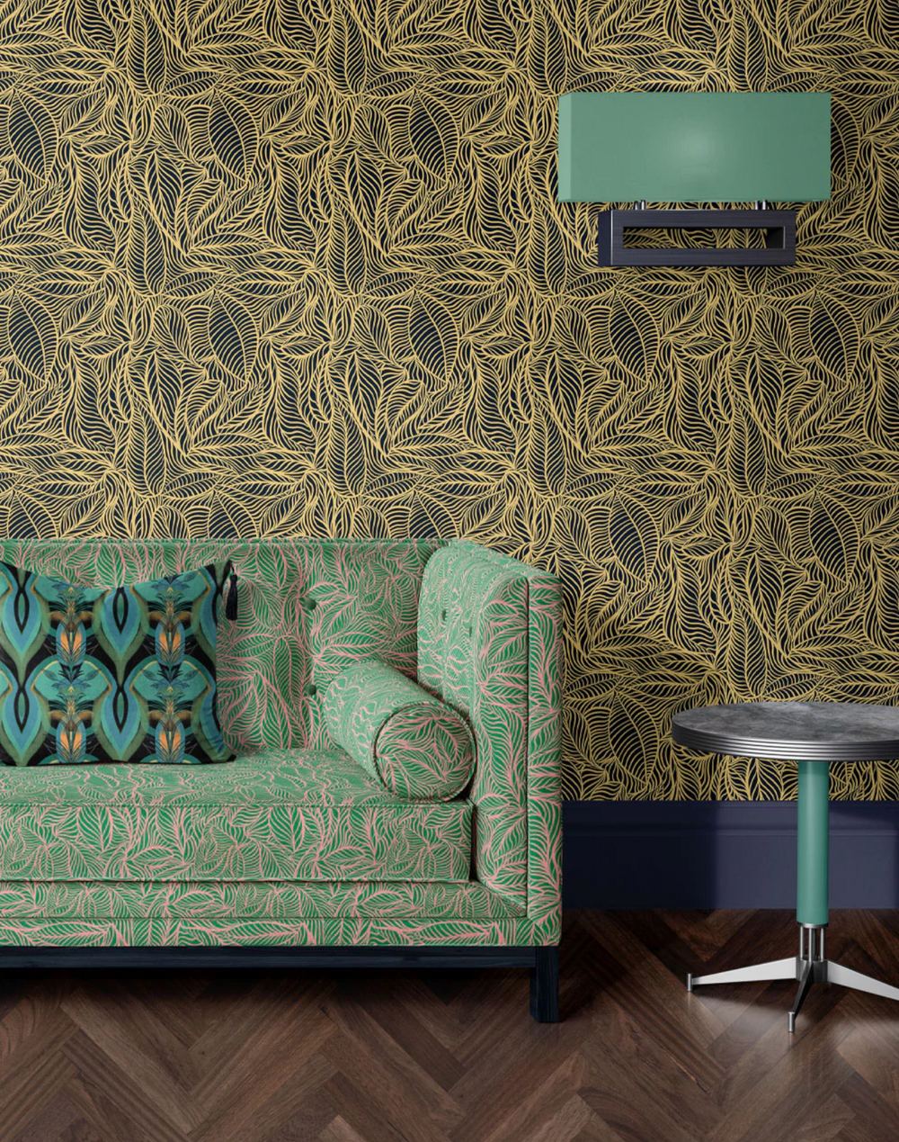 A sumptuous palette of black and gold printed onto pearlescence coated wallpaper and luster velvet will add a subtle Art Deco glamour to any room.