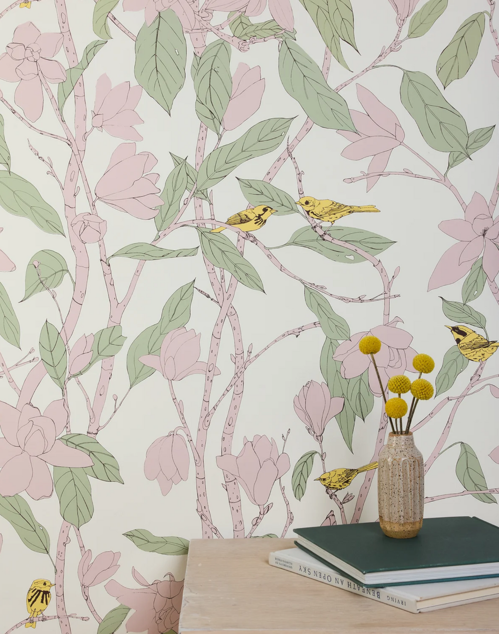 In the spirit of all things magnificent, and inspired by the San Francisco Magnificent Magnolias, Half Full brings you Analisse. A beautiful old-world style pattern, reminiscent of chinoiserie with magnolias and magnolia warblers. This pattern intertwines in a sophisticated upward-moving motion that visually lifts you up.