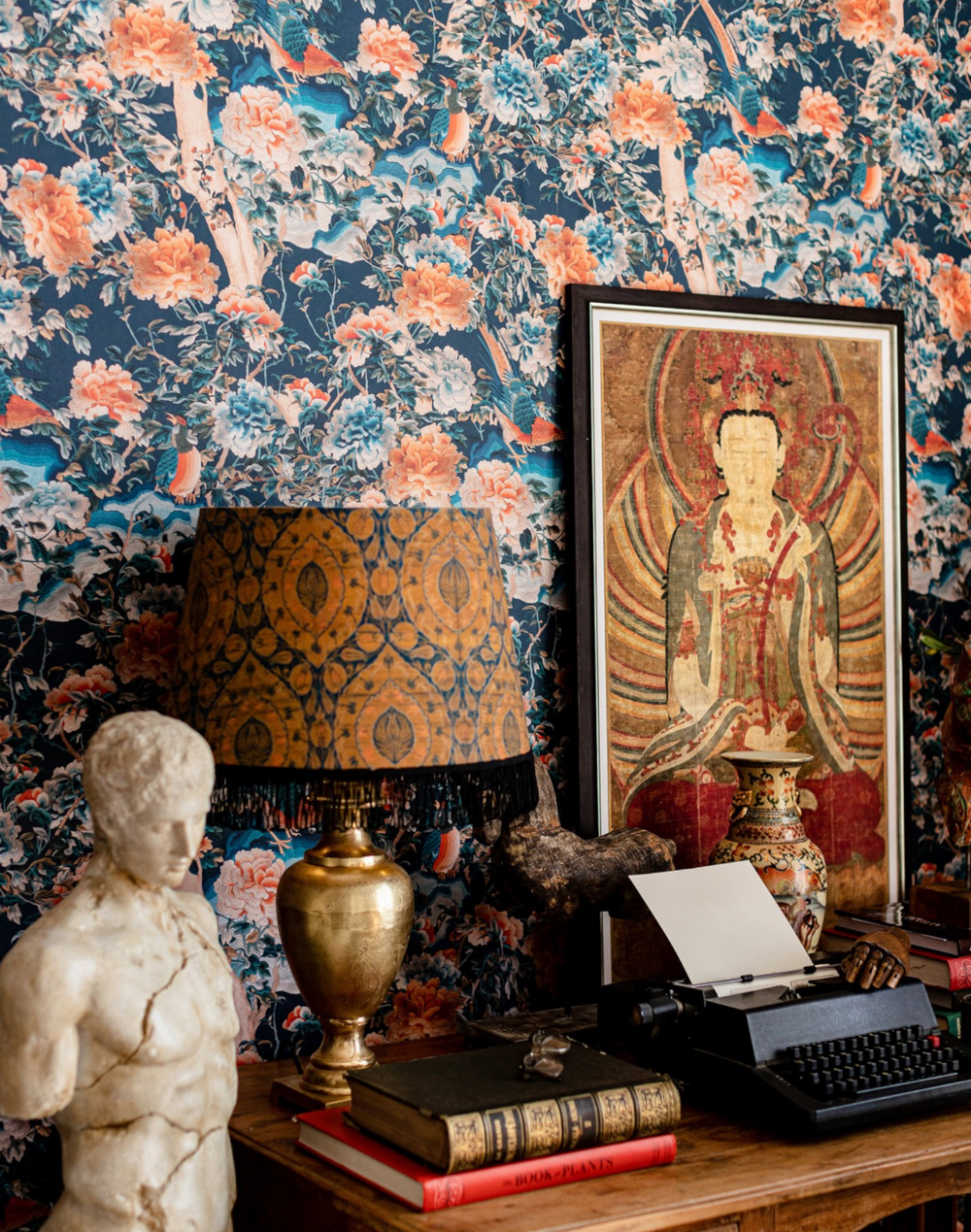 Float through the gates of this blossomy night, detailed to the smallest stems and petals. A MANCHURIAN NIGHT is a spectacle of colors and intricate shapes, with a jubilant composition captured on a beautiful full moon night. Moody and inviting, the pattern retraces soft flowery shapes against an intense blue background, while beacons of gold and orange shades bright up the entire canvas. Perfect for artistic and precious interiors, this wallpaper invokes the magical feel of Chinese blessed nature wherever it’s displayed.