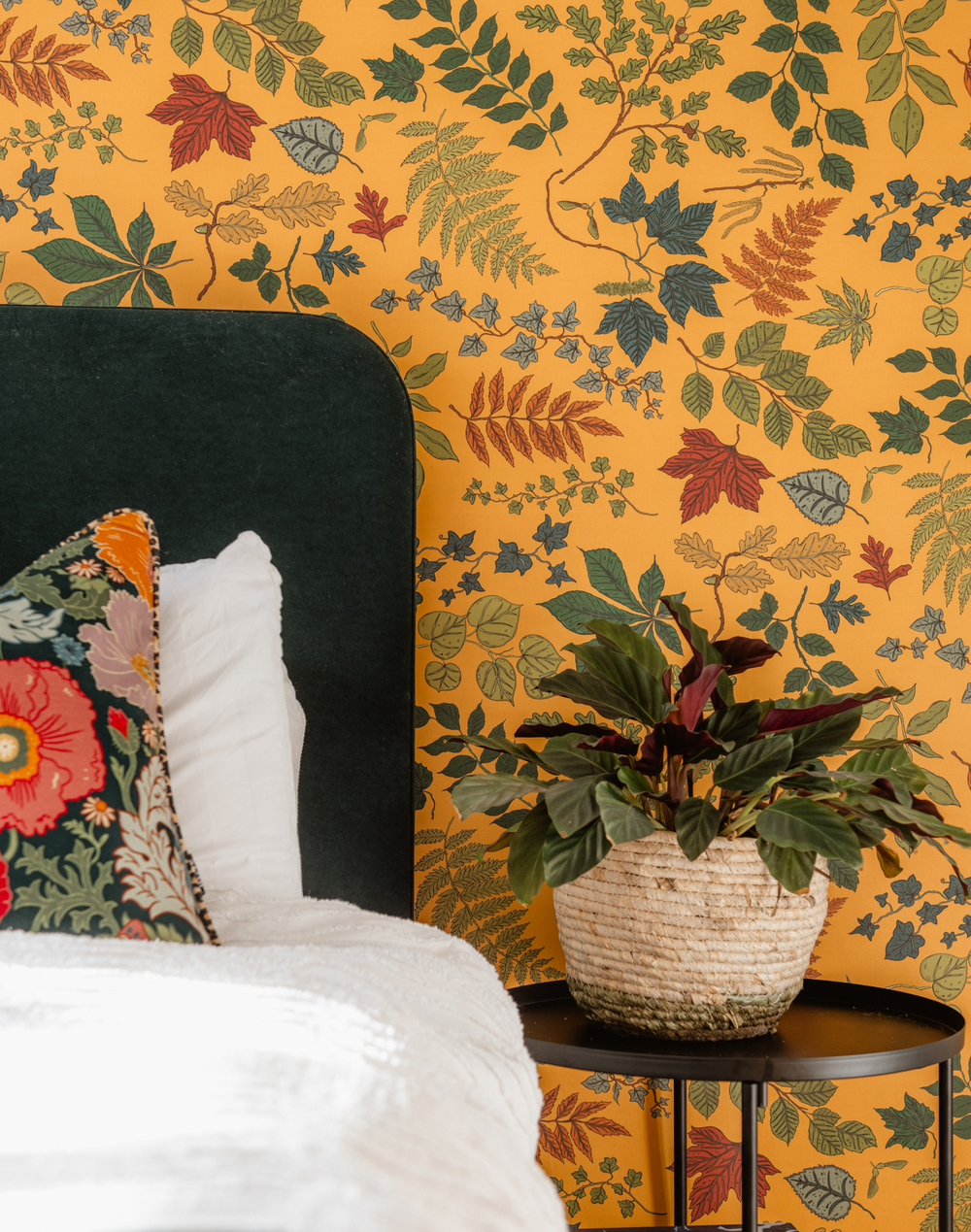 Our botanical study of beautiful British leaves. Coined Arbor’ short for Arboretum, meaning a collection of trees in a variety of species. Arbor showcases a number of tree branches and leaves such as the oak, horse chestnut, sycamore and ash. Created in our signature pen and ink illustrative style. A celebration of our mighty trees and the beauty of their yearly cycle from the dense canopies in Spring, to the piles of rusty leaves in Autumn, to the naked branches in the depths of Winter. Our Honey colorway emulates the delicious golden hue of nature’s nectar. Warm and comforting a with complimentary greens, rusts and emerald greens to conjure up cozy Autumnal vibes.