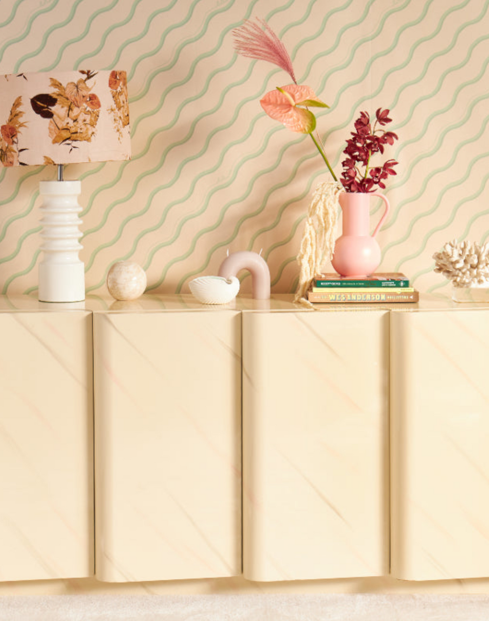 Inspiration for this design first came from Murano's milky glass Mushroom lamp. Our pearlized Belissima wallpaper reimagines the curves and shadows of the lamp through this versatile and effortlessly luxurious yet fun design. The word 'Bellisima' has been hand-written by Whinnies dad and incorporated into the final art, thanks Stu!