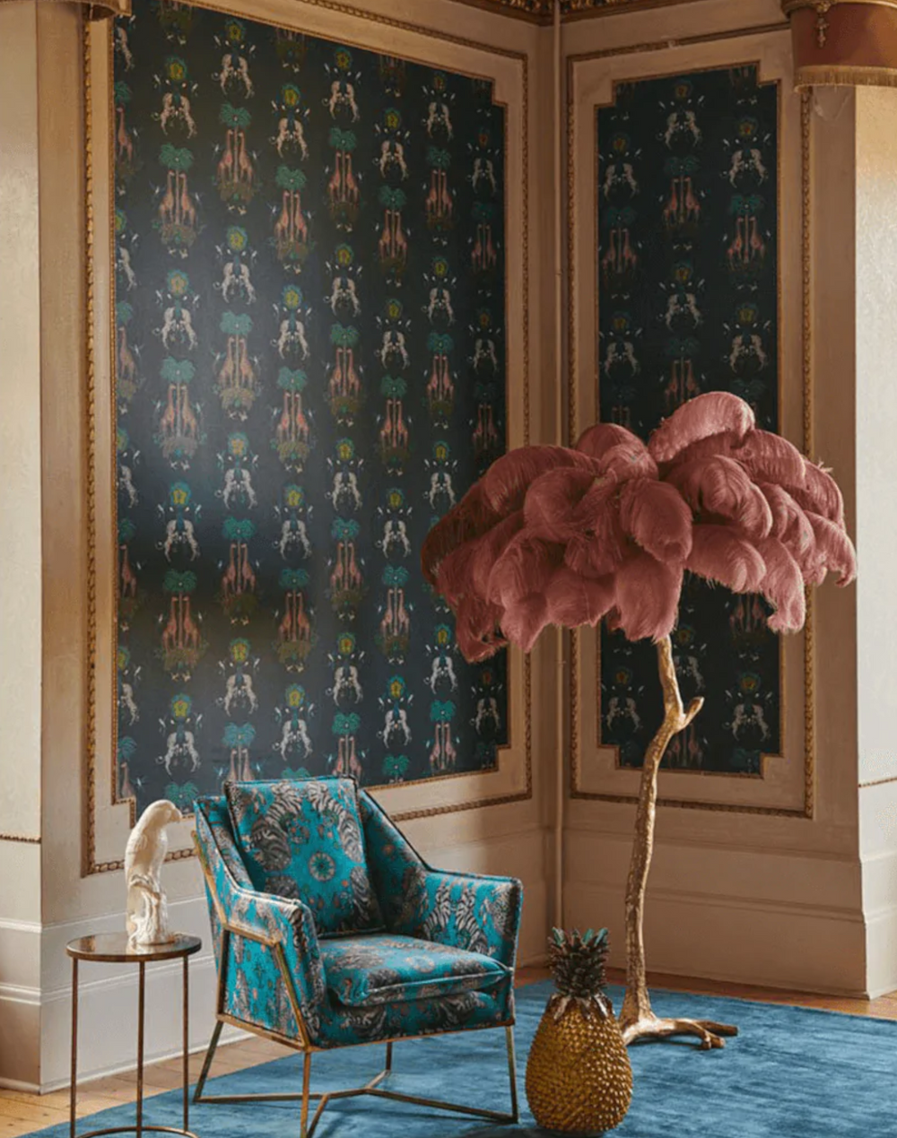 The Creatura Wallpaper is part of our magical Wilderie collaboration with interior experts Clarke & Clarke. Curious spotted giraffes shelter under a mystical palm, while zebra unicorns prance amongst hummingbirds and surreal details. This wallpaper is an updated, playful take on the popular Kruger design, inspired by a South African safari. The vibrant peachy pink shades are highlighted with bold touches of pistachio green and zebra print, that will inject an air of jungle maximalism into your interior scheme.