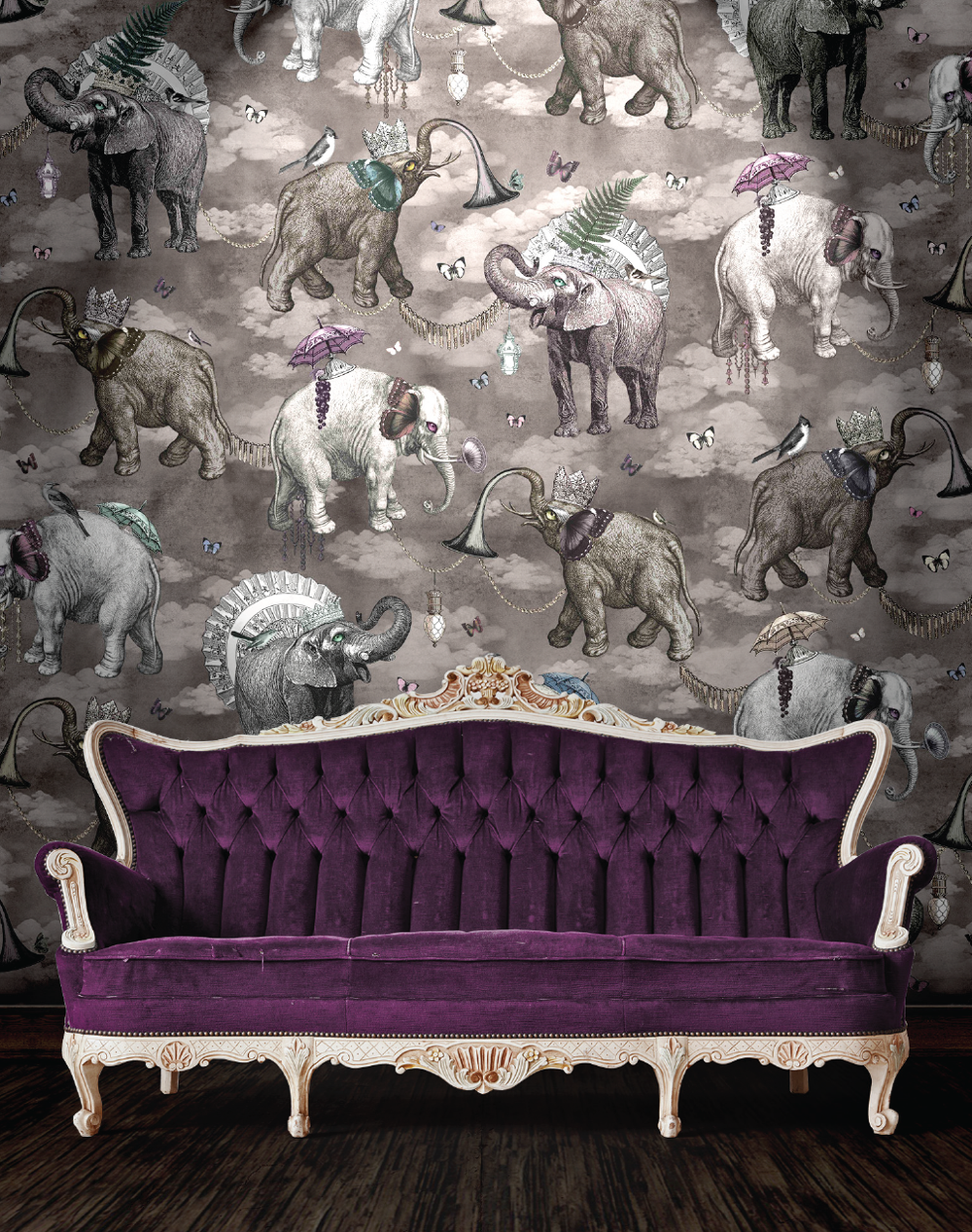 Witness an elaborate procession of majestic elephants, showcasing an array of surreal accessories in inimitable style. A haze of antique silver clouds creates a wonderfully imperial backdrop to this whimsical daydream. Printed on unique pearl iridescent paper, the beautiful burnished finish will gleam with a pearly glow as it catches the light.
