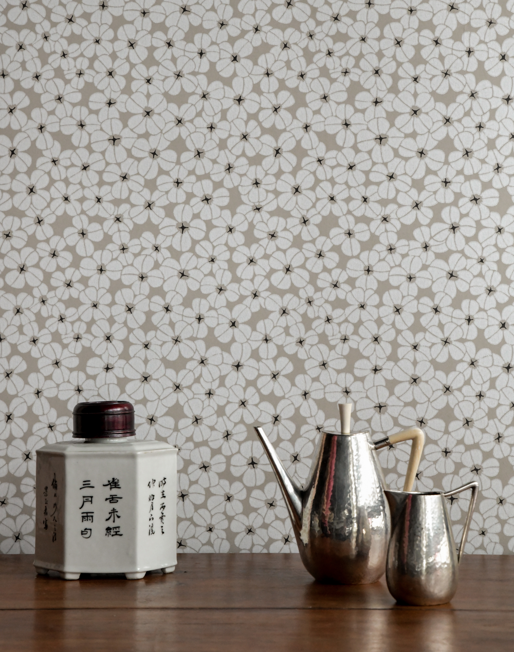 Creamy white and charcoal illustration on a taupe background