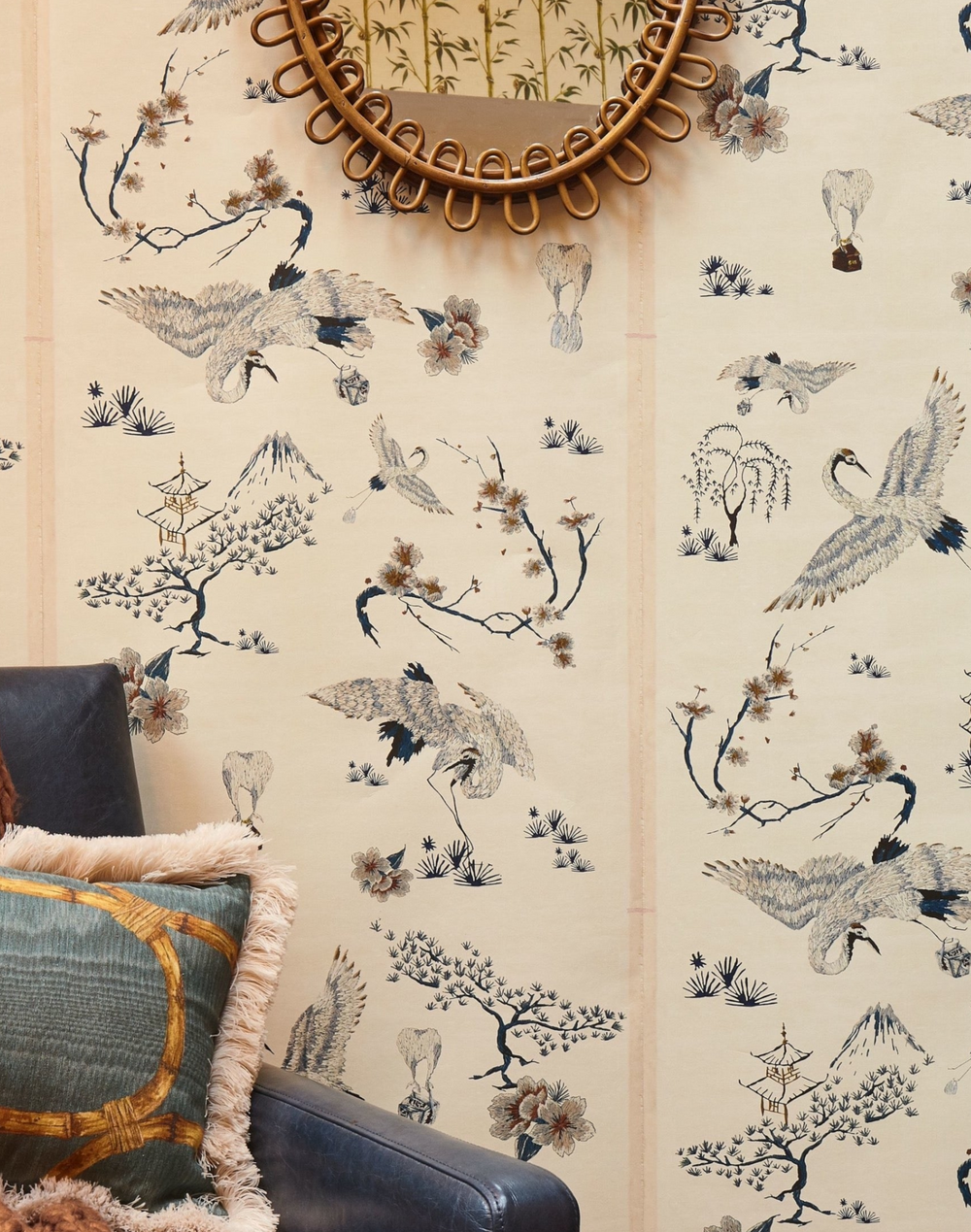 The folklore story of a stork delivering babies has been given a modern twist with a different bundle of joy, our favorite take-aways. Look out for the small packages of hot foods being delivered by uber-elegant storks, get it? This chinoiserie style print was carefully hand-embroidered in-house onto vintage slub silk; after which the design has been digitally captured, with the fabric edges left in to create the stunning illusion of silk dressed walls once the paper is hung.
