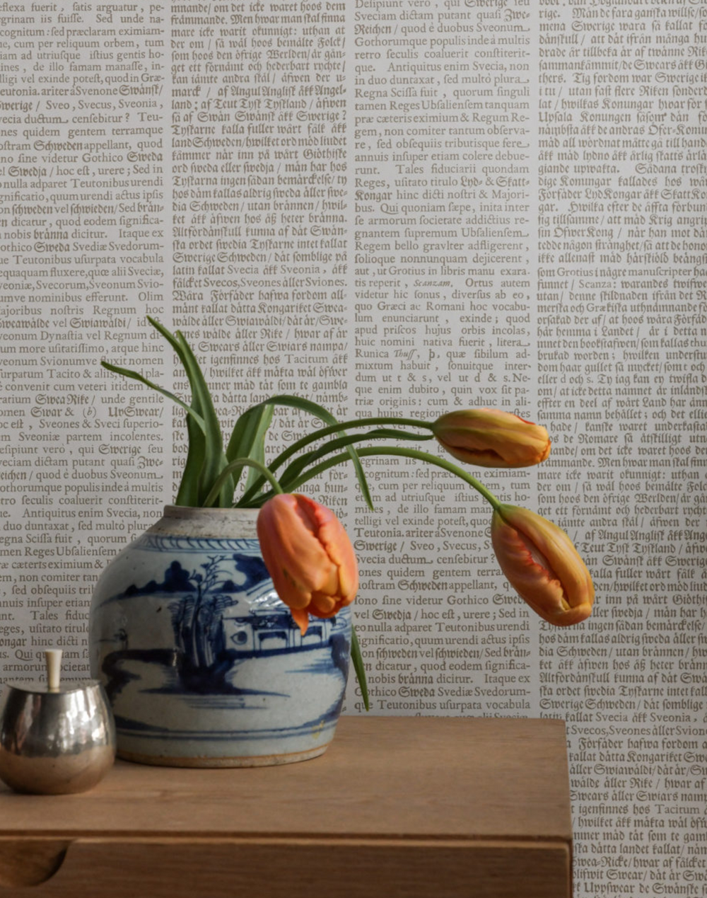 An old story about 17th century Sweden written in Latin and Swedish forms the stripes in this pattern. As a letter from a bygone era to our modern world. The text is taken from the work Suecia antiqua et hodierna.
