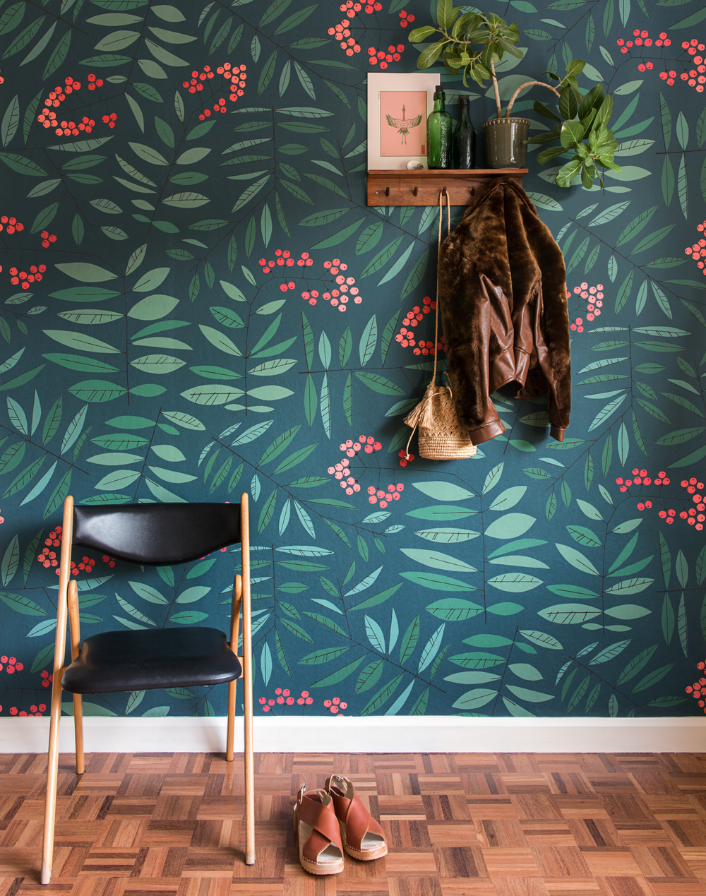 A large-scale mural version of the Leaf Berry design, Grand Leaf Berry takes abstract botanical design to a new dimension. A multi-colored pattern, this eye-catching mural is certain to turn heads with its intricately drawn berry sprigs and leaves