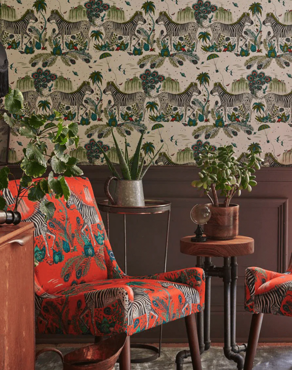 The Lost World Wallpaper is part of our Wilderie collection made in collaboration with interior experts Clarke & Clarke, and features an enchanting scene of discovery. With elements inspired by Jules Verne novels and the 1925 silent film The Lost World, the design details curious peacock-tailed zebras, winding foliage, towering mountains and mighty dinosaurs in the distance. There`s a whole world to explore within this intricate design! The tonal shades of jungle greens, teal, zebra print and accents of burnt orange bring the design to life on the off-white ground, and will inject jungle fantasy into your home.
