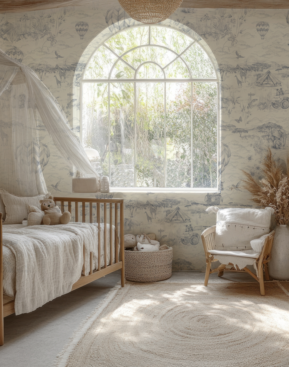 "Lyons Den" is Victoria’s take on the classic toile de Jouy wallpaper, reimagined to tell the enchanting tale of an animal-led safari. This design brings a whimsical twist to the traditional pastoral scenes typically associated with toile, replacing them with a vibrant and imaginative narrative where animals take center stage.