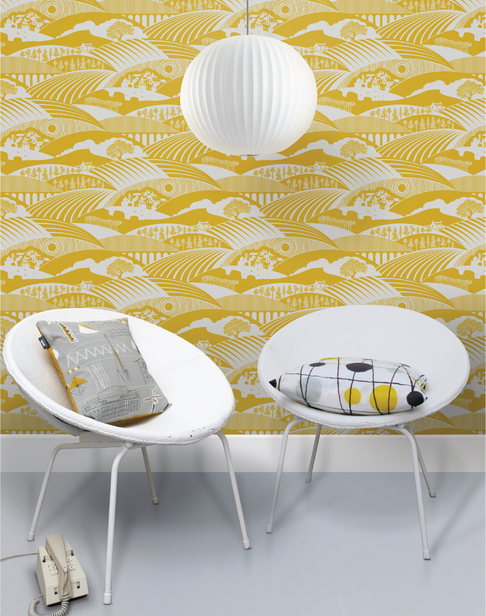 Moordale (the distance between us) wallpaper is the latest release from our Saturday Night/Sunday Morning collection - and features the North Yorkshire Moors and Yorkshire Dales, where Mark and Keith of Mini Moderns spent their teenage years. Icons of the area included in the sweeping landscape print are Roseberry Topping and the Cow and Calf at Ilkley.