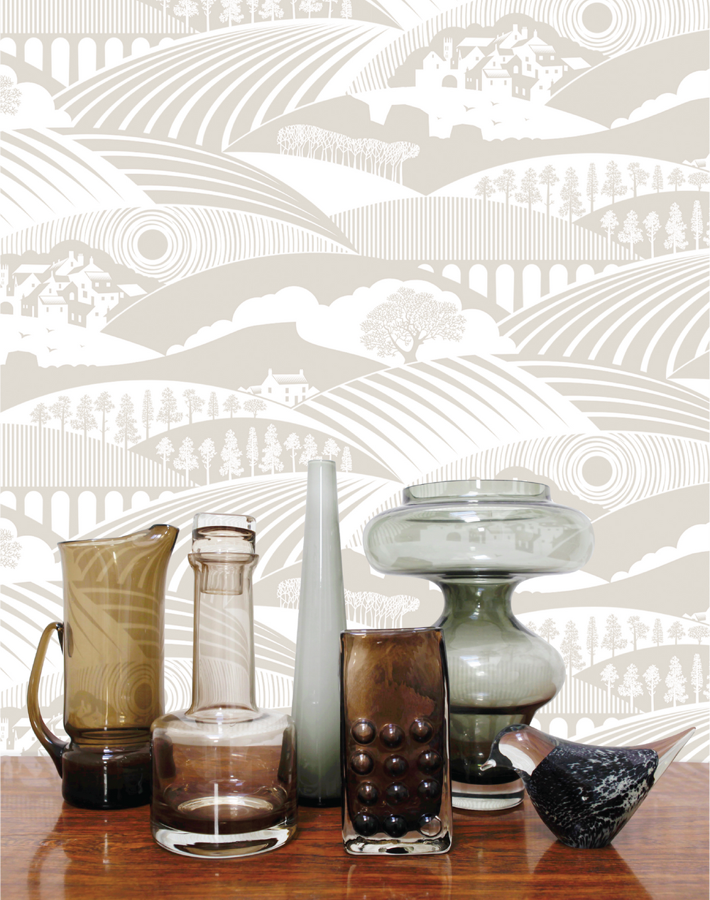 Moordale (the distance between us) wallpaper is the latest release from our Saturday Night/Sunday Morning collection - and features the North Yorkshire Moors and Yorkshire Dales, where Mark and Keith of Mini Moderns spent their teenage years. Icons of the area included in the sweeping landscape print are Roseberry Topping and the Cow and Calf at Ilkley.