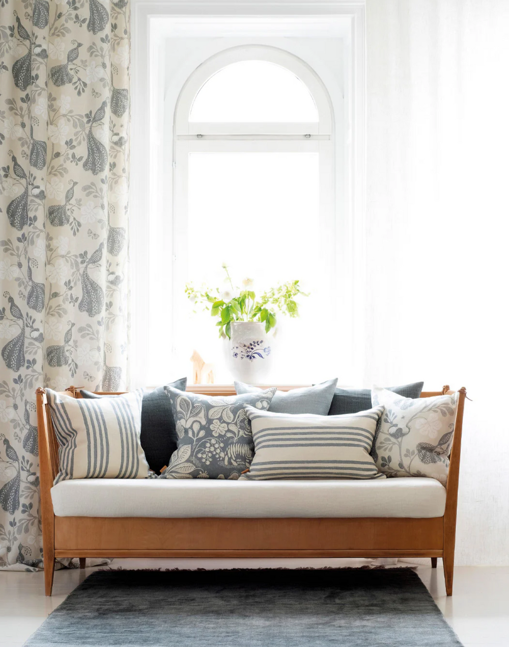 Our Night birds print is inspired by the return of the spring light, when the air is warm the night birds start singing their hearts out during beautiful late night soarés. Remarkable love songs reaching through both time and space with hope of making it all the way into someone’s heart. Night Birds is drawn by hand and is printed by our Master printers on our beautiful and sustainable high quality linen weave, which is lively and make our patterns age with grace.