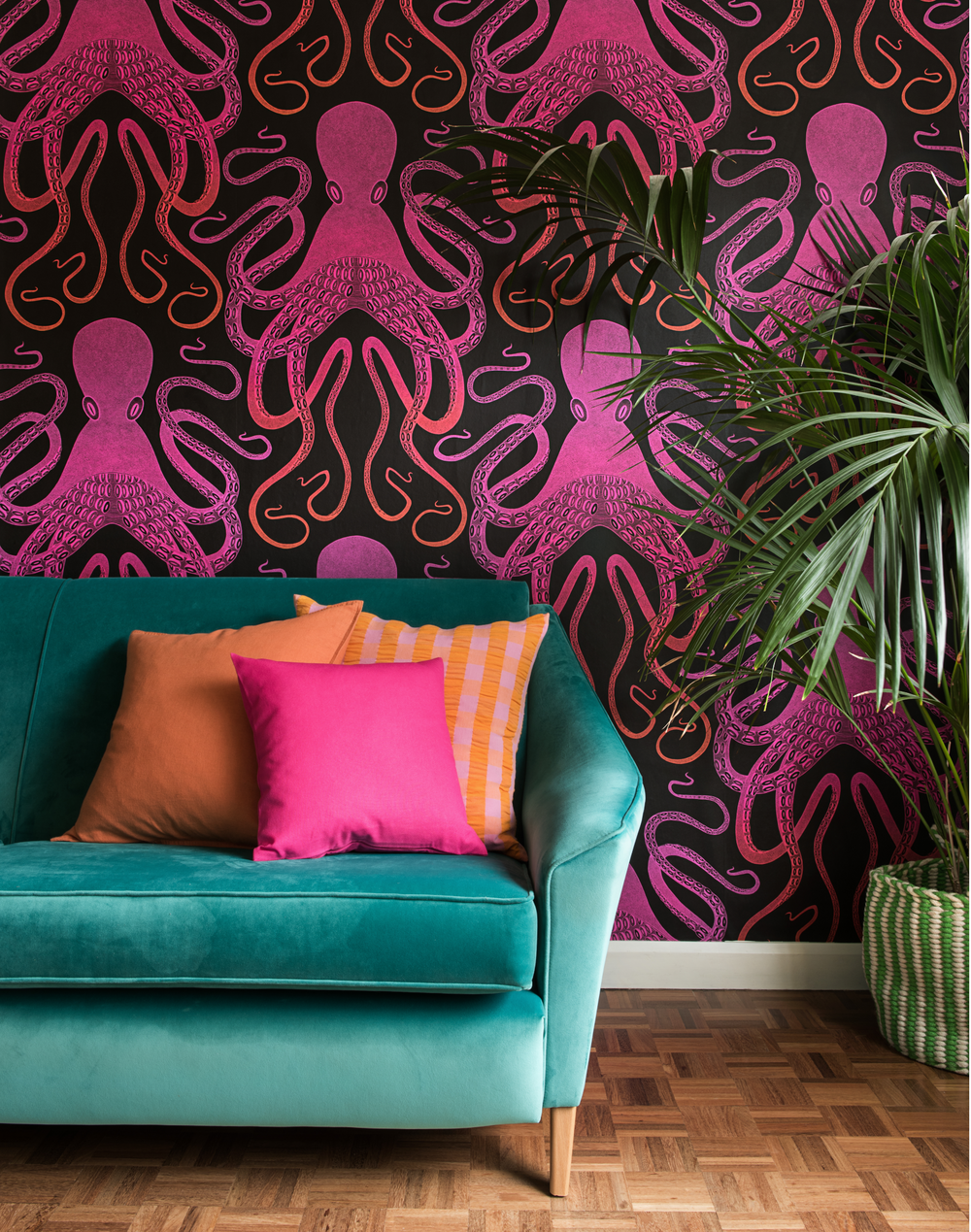 Bold, bright and vibrant, the Octopus pattern has been digitally printed using a two-tone ombre effect. From a fiery red to a hot pink, this wallpaper is certain to act as a wonderful focal point for those who favor an eclectic, characterful interior style.