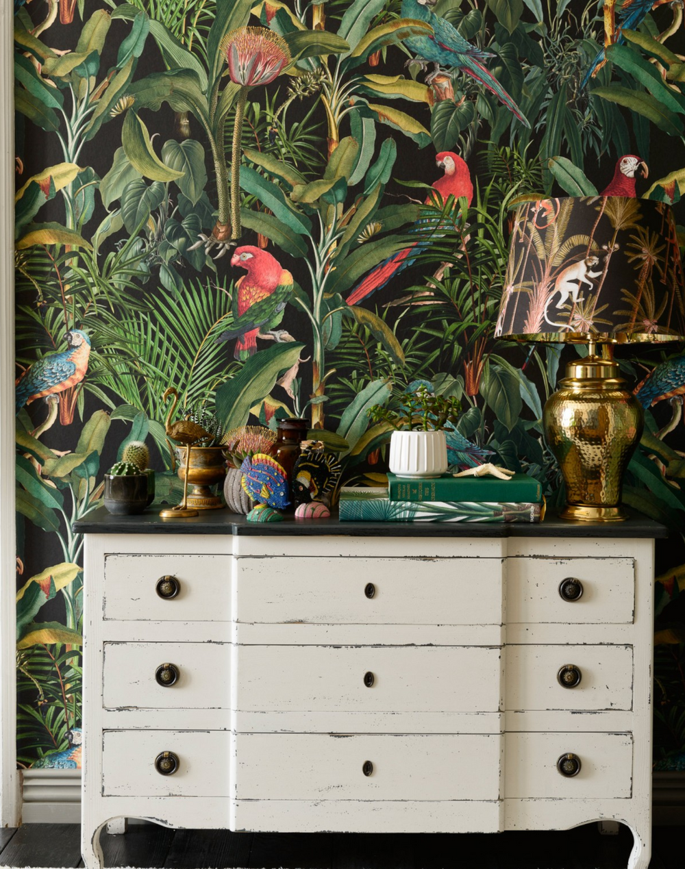 In this vibrant wallpaper design, inspired by the beautiful flora and fauna of Brasil, there is a stylish mix of beautifully illustrated parrots and tropical plants, in an effort to recreate the paradisiac feel of a lush exotic habitat. Each parrot, elegantly highlighted with bright strokes of color, adds to the complexity of the exquisite wallpaper. From the scarlet macaw, to various parakeet species, the layout is full of lively symbols of the evergreen forests of Brasil, emphasizing the rich ecological diversity of the region.