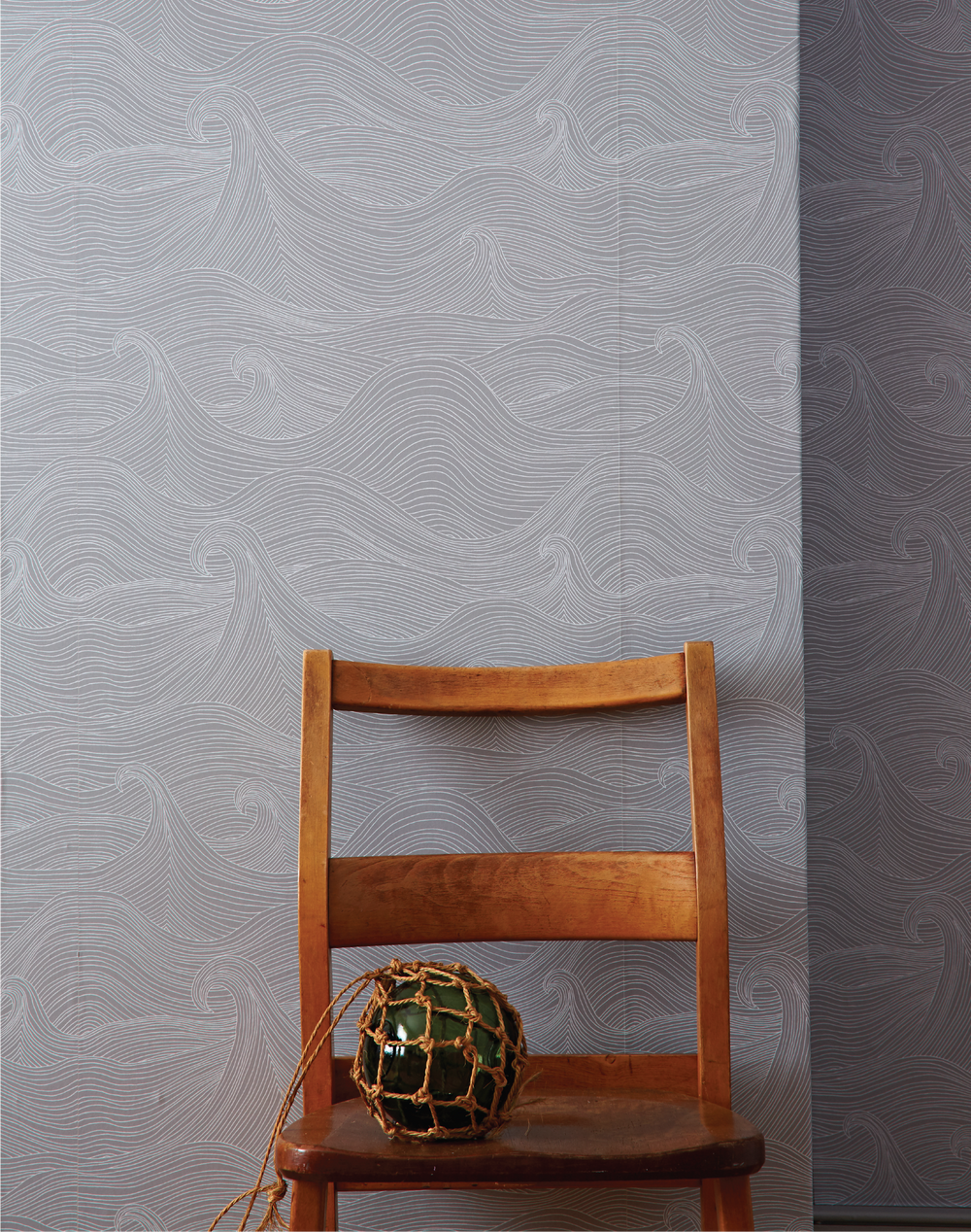 Seascape wallpaper in Dusk is a white line drawing on a moody grey background inspired by the rolling waves of a tempestuous sea designed to flow across your walls.
