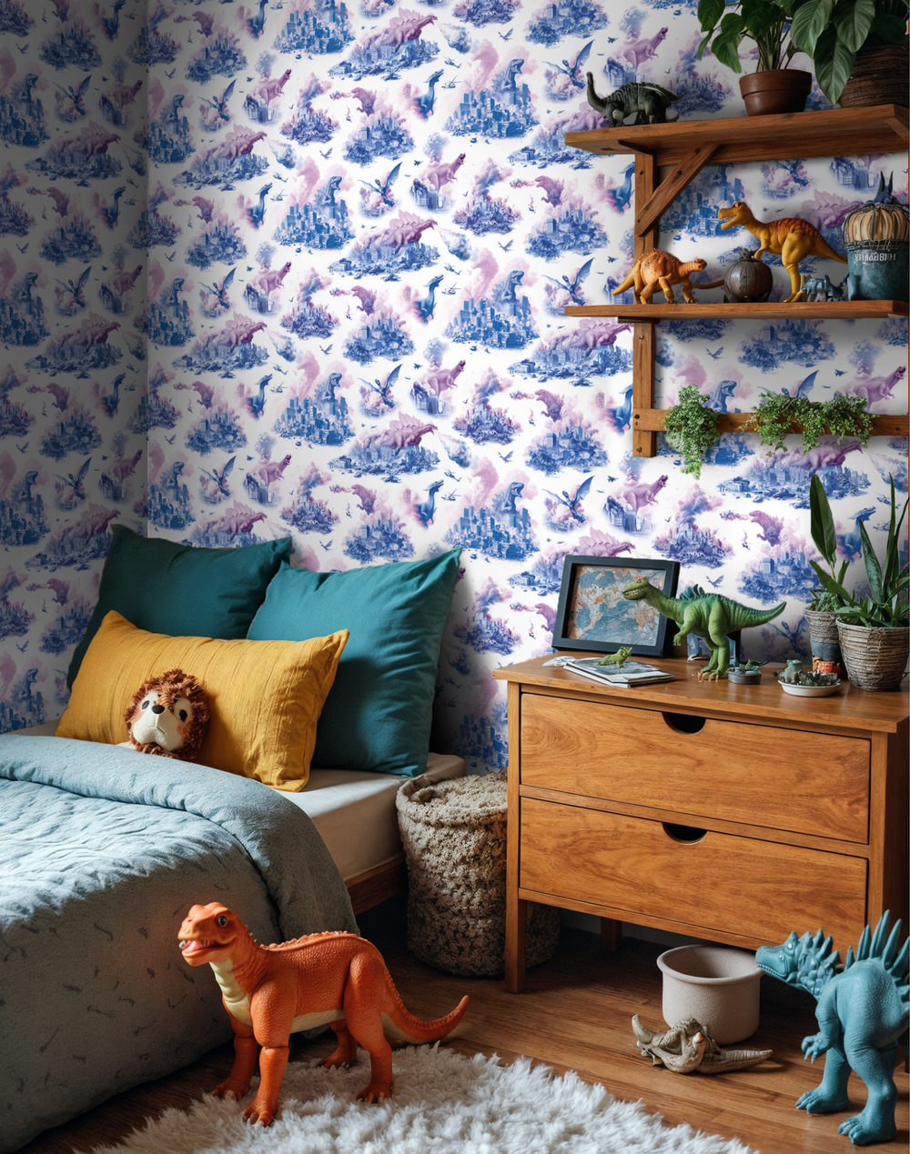 Our brand-new luxury rampant dinosaur wallpaper, "Toile de Jurrassic," is a lighthearted take on the wildly popular 18th-century Toile de Jouy motifs. Award-winning designers Simon Critchley and Rachael Doble produced this exquisitely designed luxury wallpaper especially for Carmine Lake.