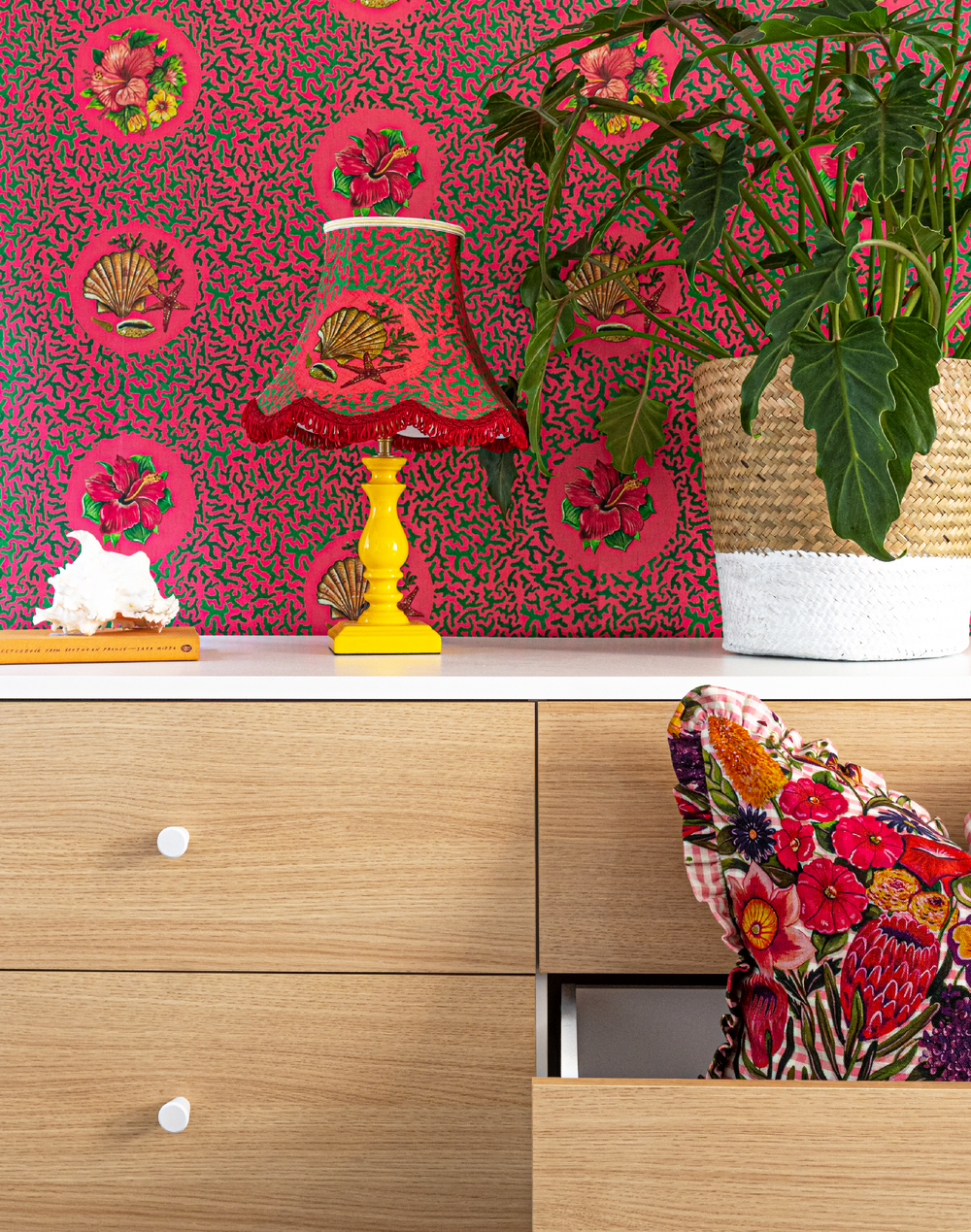 Treath meaning 'beach' in the Cornish Language. Treath pays homage to a nautical yet sophisticated style showcasing a natural coral like structure with spherical cut outs. Each scene features tropical ocean inspired flora and fauna such as Hibiscus flowers as well as gorgeous seashells and starfish. This playful Cerise Pink and emerald-green colorway creates a wonderful warm yet bold statement whilst being fun and inviting. Hot Pinks contrast against vivid red, warm yellow and emerald green.