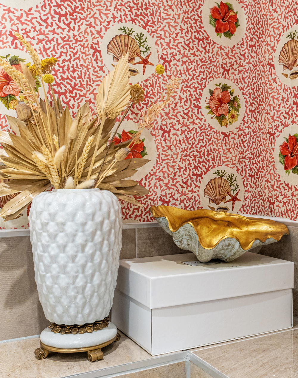 Treath meaning 'beach' in the Cornish Language. Treath pays homage to a nautical yet sophisticated style showcasing a natural coral like structure with spherical cut outs. Each scene features tropical ocean inspired flora and fauna such as Hibiscus flowers as well as gorgeous seashells and starfish. This Coral colorway acclaims natures true natural color palette. Beautiful coral-pink sits on a warm cream linen base. With notes of olive green and buttery yellow. This colorway is quintessential to a seaside interior with a minimal, bohemian vibe.