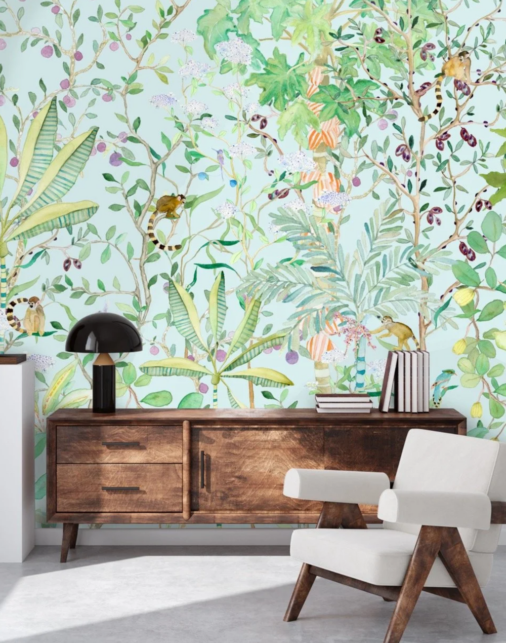 Our new timeless classic, this panoramic wallpaper captures the soul of the Atlantic forest in Brazil’s Southern Coast line with graceful botanical detail. Tropicalia panoramic wallpaper is a vibrant Chinoiserie-inspired design featuring lush Brazilian flora, tropical fruits, and playful monkeys hidden among exotic flowers. Add a whimsical, joyful touch to your walls with this lively botanical mural.