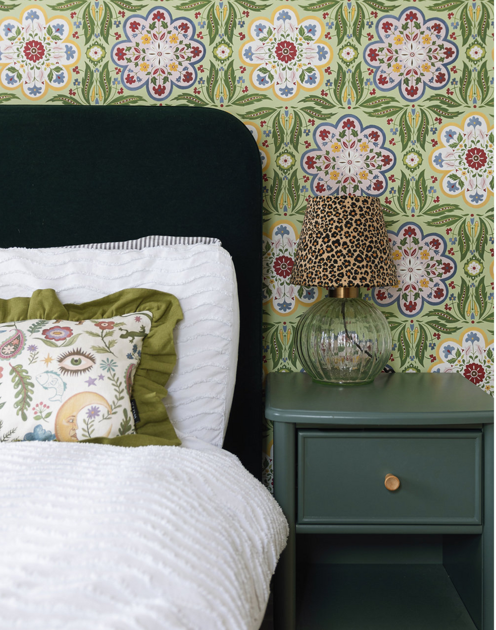 Our Zouak Wallpaper in Pistachio Green is a gorgeous geometric style print inspired by the beautiful painted ceilings of the Bahia Palace in Morocco. Our print pays homage to the craftmanship and skill of zouak, the name given to the traditional art of decorative wood painting. The compositions would emphasize symmetry and repetition giving a sense of depth and grandeur.